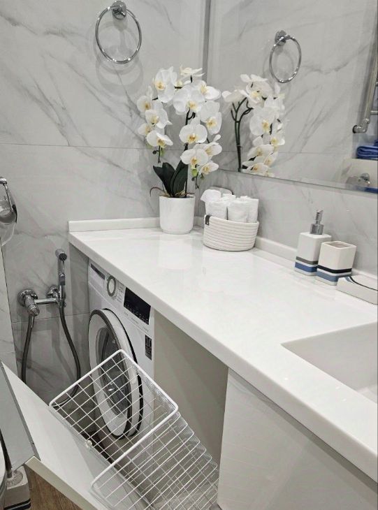Санузел оснащен встроенной душевой системой с термостатом (Grohe), стиральная машина (Bosch).