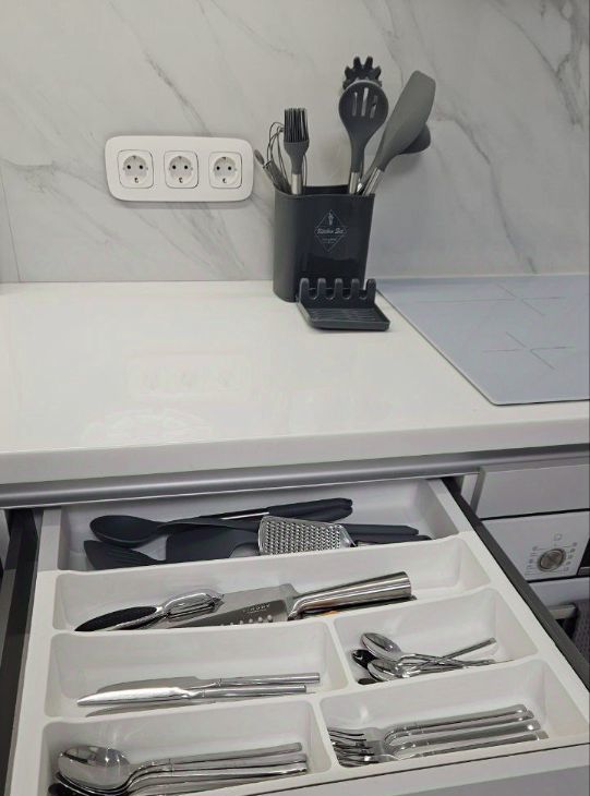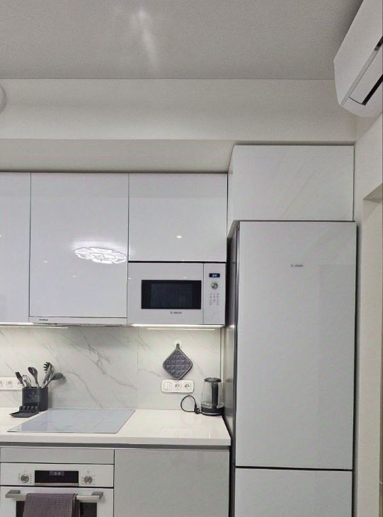 Просторная кухня совмещена с гостиной площадью 18 кв. м и оснащена всей необходимой мебелью и техникой (вся техника в квартире Bosch): холодильником, микроволновой печью, варочной панелью, духовым шкафом, посудомоечной машиной. В комнате и кухне-гостиной есть кондиционеры. В квартире есть всё необходимое для комфортного проживания!