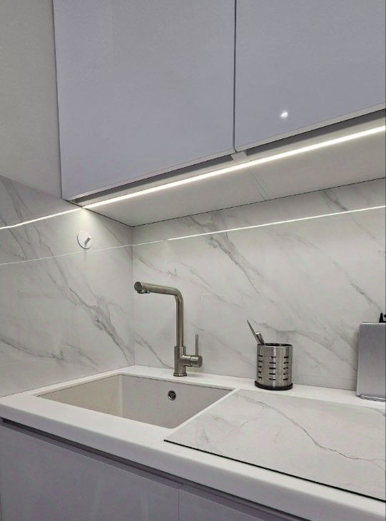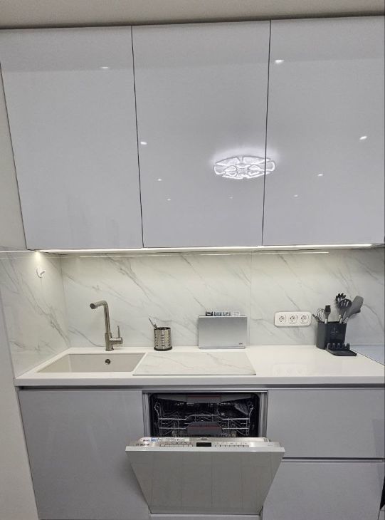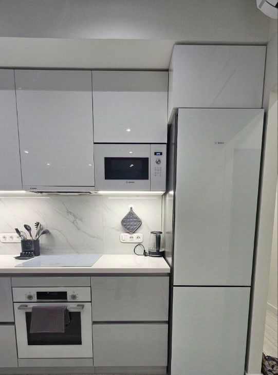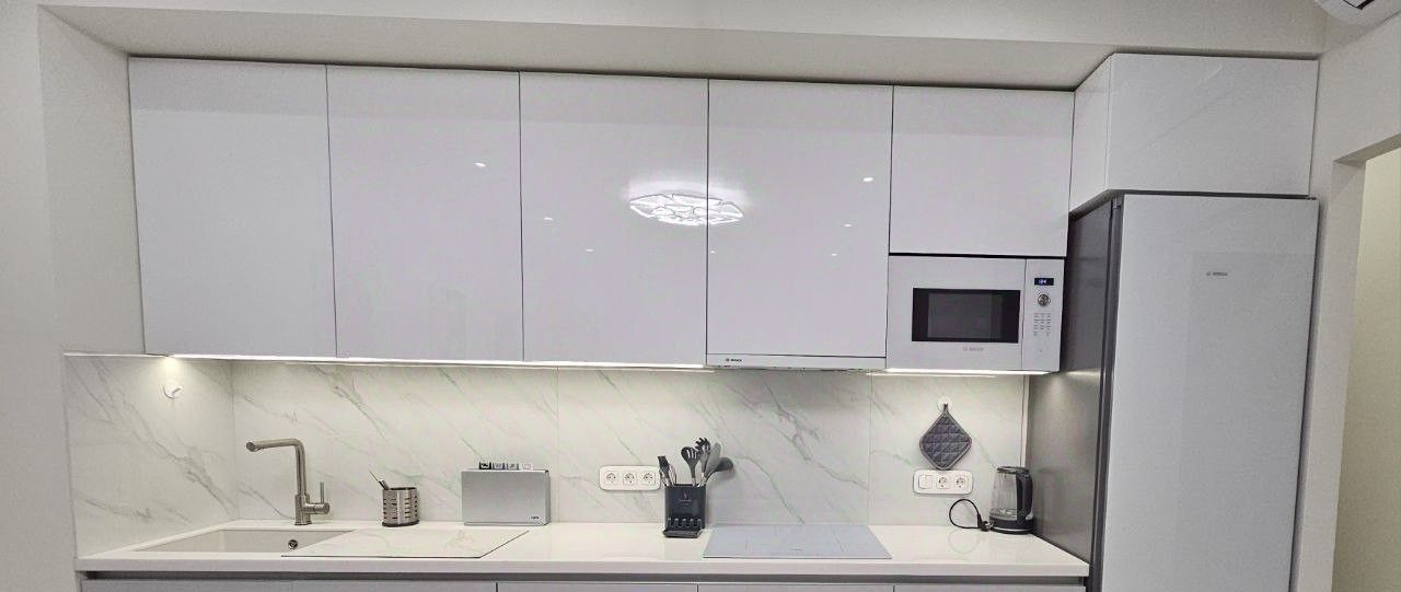 Просторная кухня совмещена с гостиной площадью 18 кв. м и оснащена всей необходимой мебелью и техникой (вся техника в квартире Bosch): холодильником, микроволновой печью, варочной панелью, духовым шкафом, посудомоечной машиной. В комнате и кухне-гостиной есть кондиционеры. В квартире есть всё необходимое для комфортного проживания!