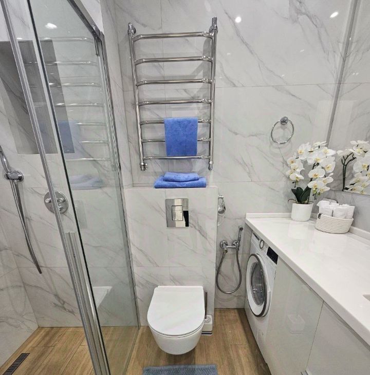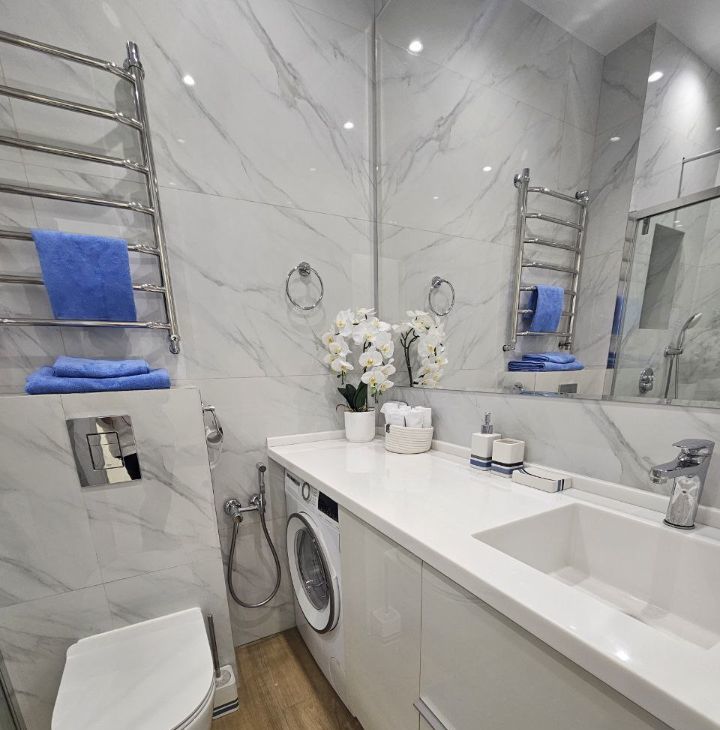 Санузел оснащен встроенной душевой системой с термостатом (Grohe), стиральная машина (Bosch).