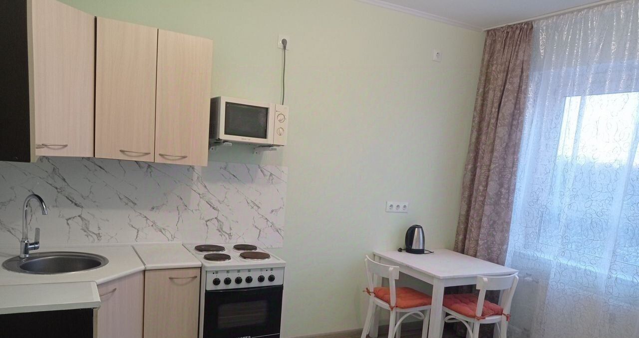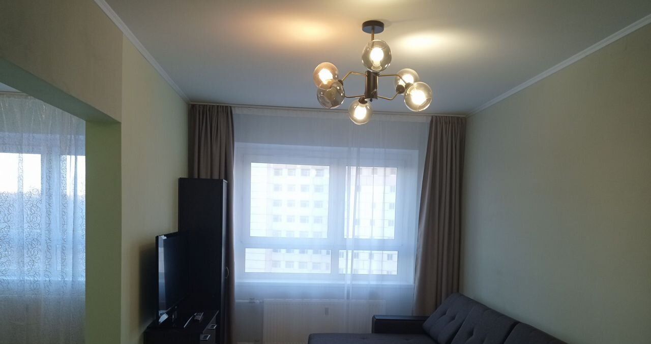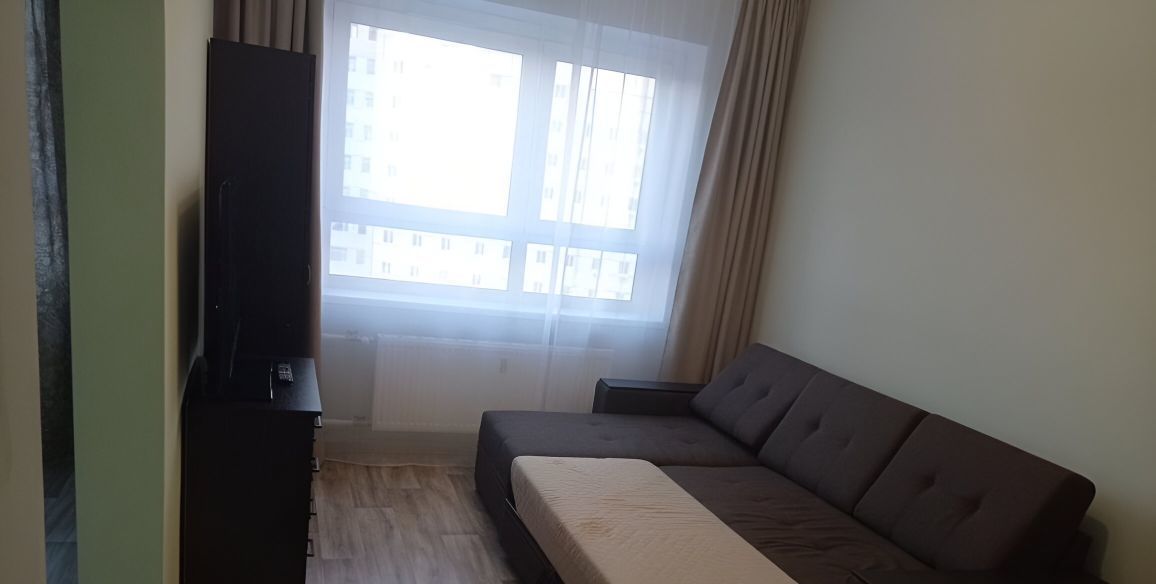 В квартире выполнен свежий ремонт. Просторная комната и кухня оборудованы необходимой бытовой техникой и мебелью, включая телевизор, холодильник, микроволновую печь.