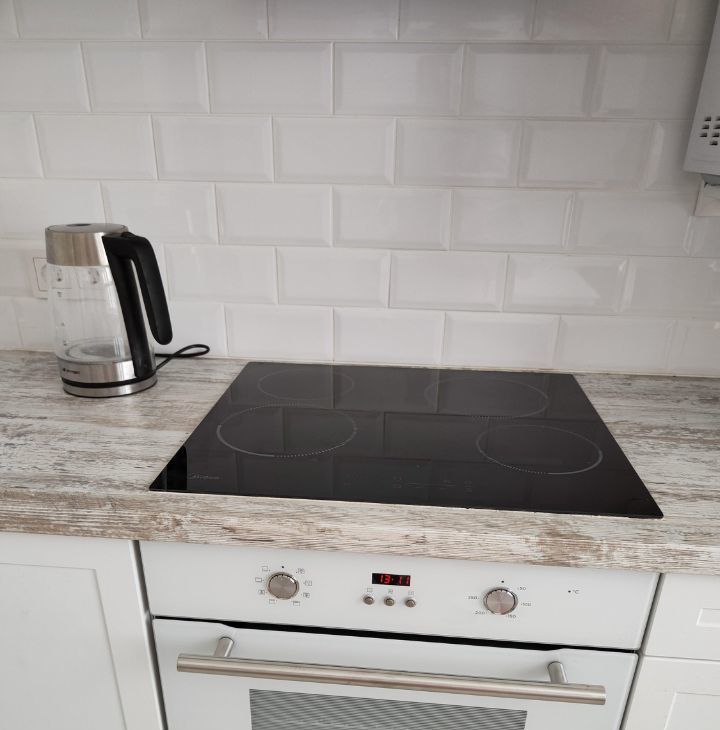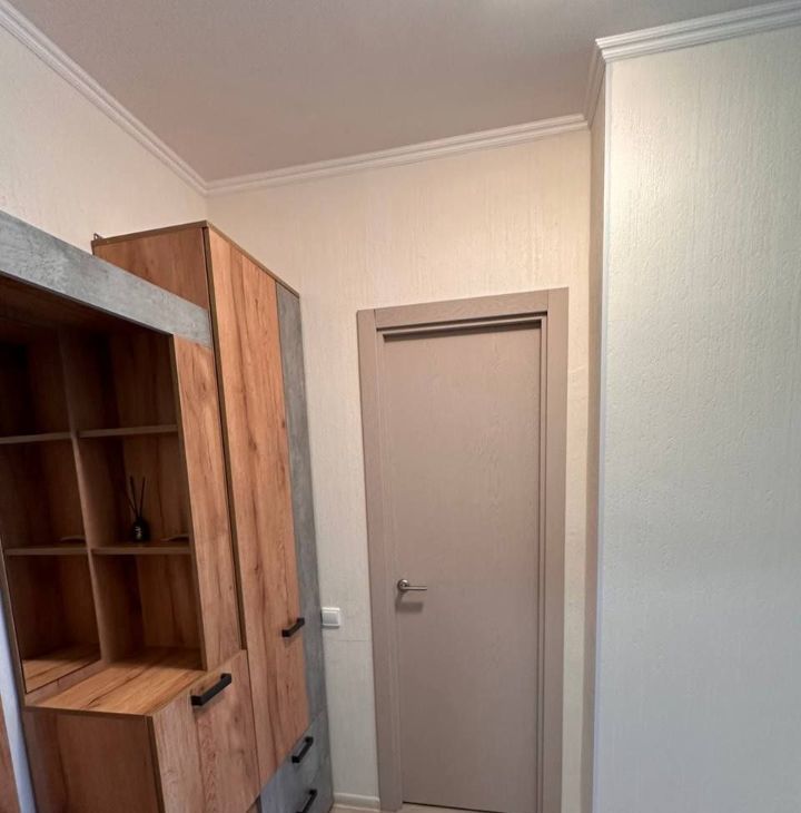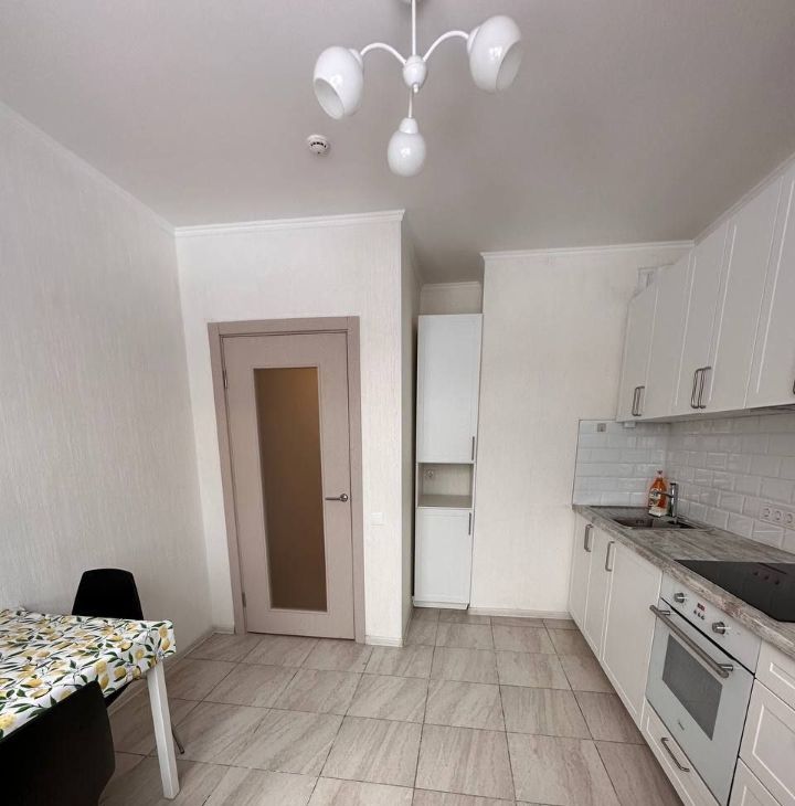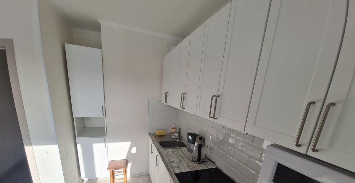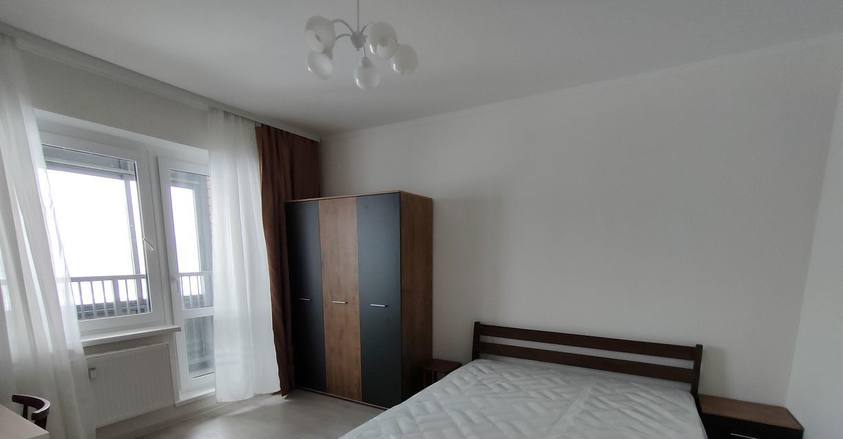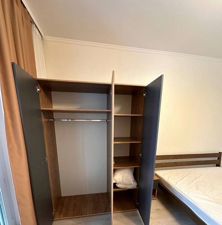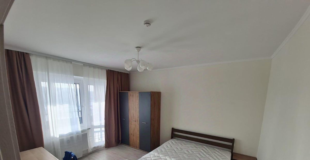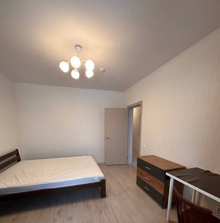 Встроенная кухня с варочной панелью и духовым шкафом, большая застеклённая лоджия. В комнате двуспальная кровать с новым матрасом, шкаф, рабочий стол.