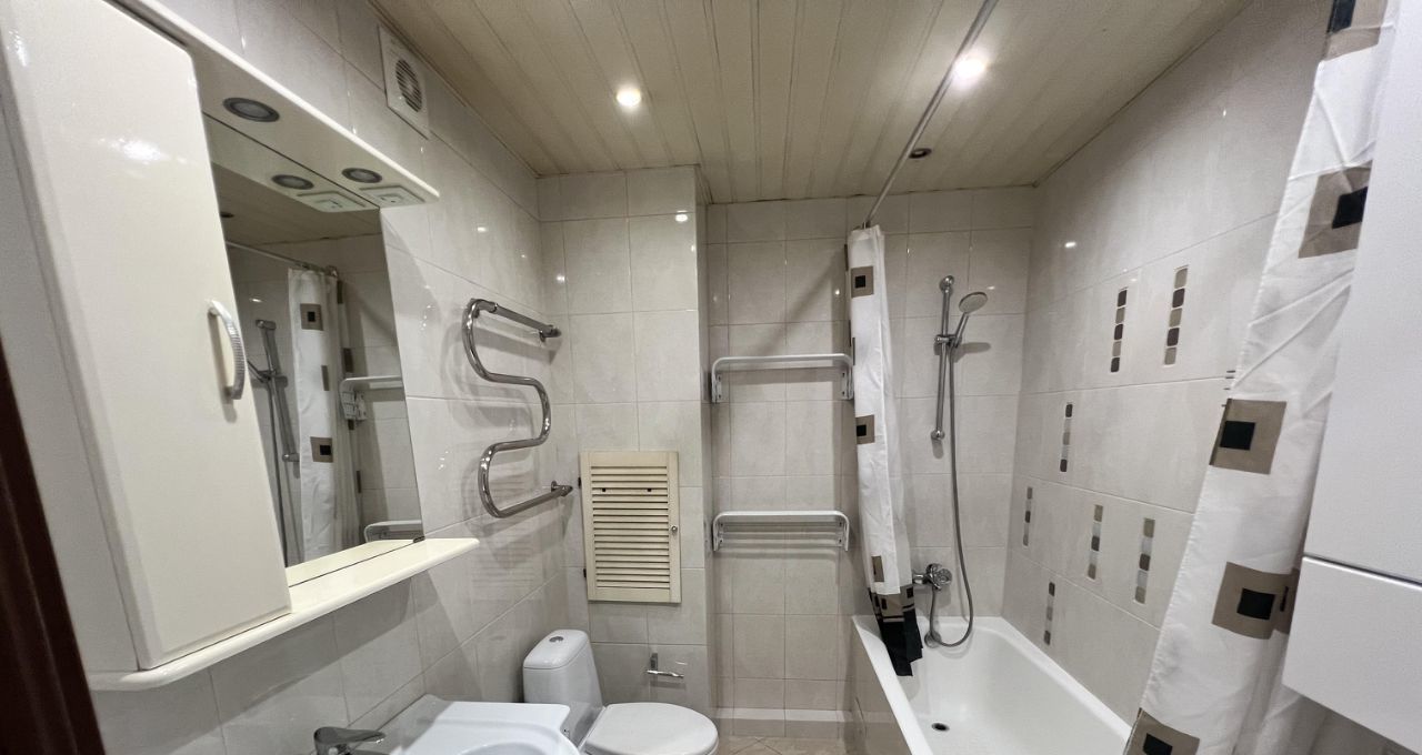 7. Совмещенная просторная ванная комната, где установлены крепления для сушки вещей, теплые полы.
