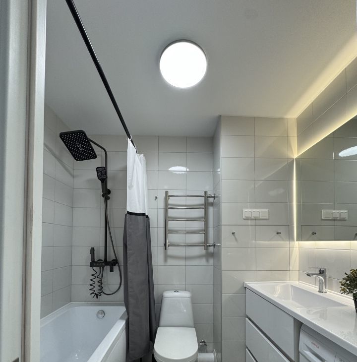 Красивый санузел с ванной, зеркало с подсветкой, стиральная машина,