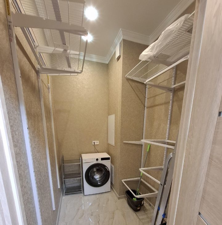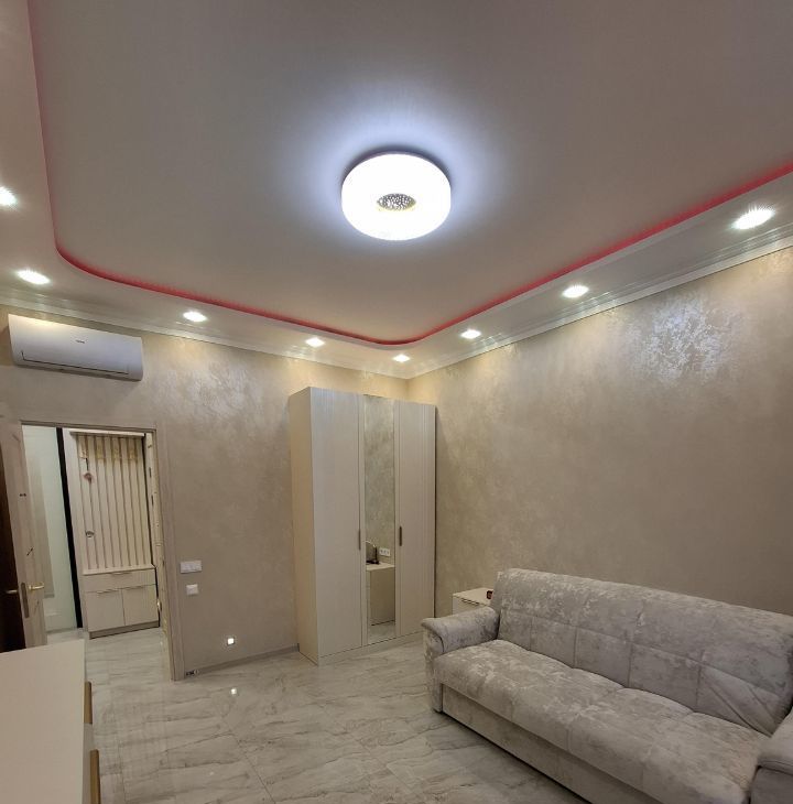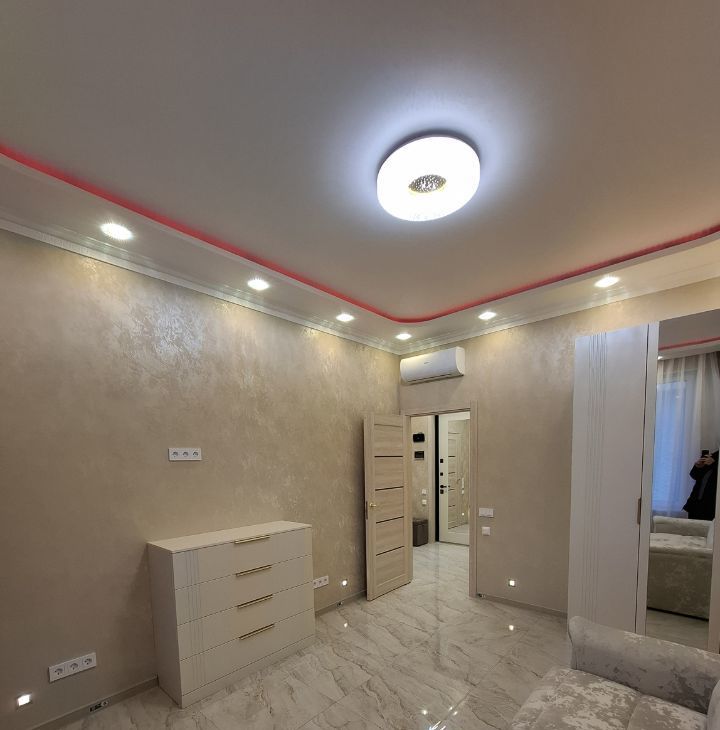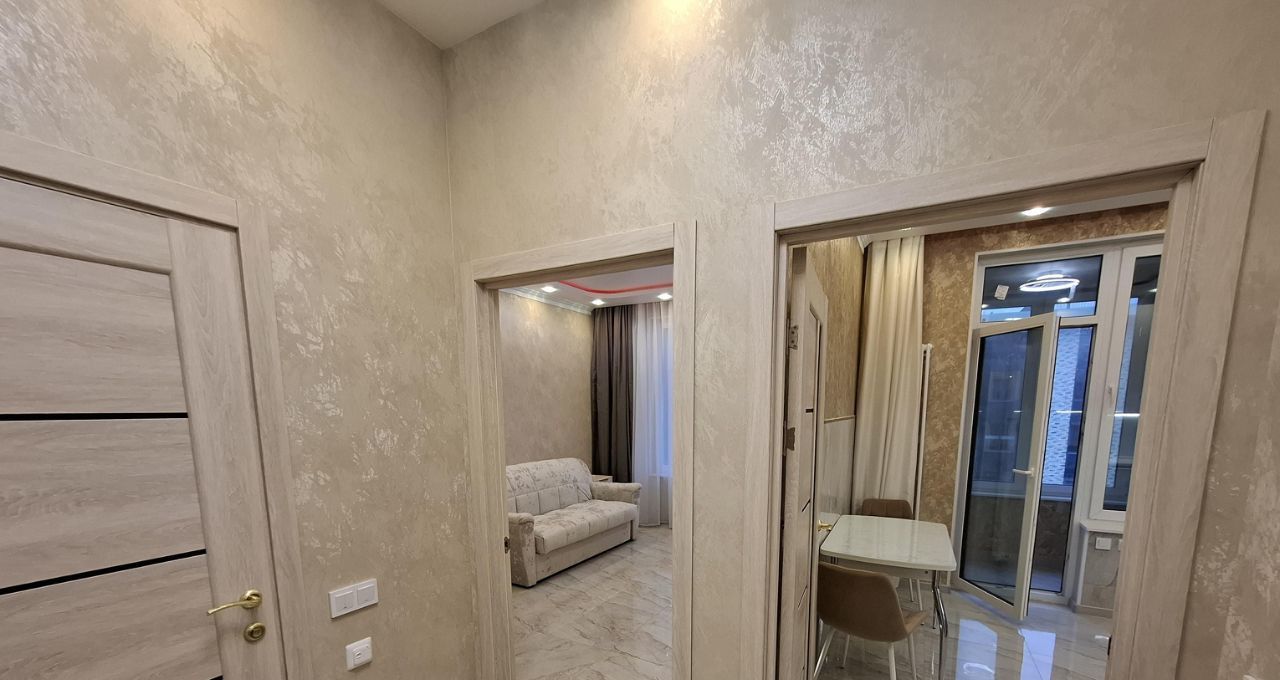 В квартире выполнен дизайнерский ремонт, который подчеркивает стиль и комфорт. Просторная жилая комната площадью 18 кв. м обставлена современной мебелью, есть кондиционер для вашего комфорта в любое время года. Кухня площадью 10 кв. м оснащена всей необходимой техникой: холодильник, посудомоечная машина, стиральная машина. Ванная комната с ванной — отличное место для релакса после долгого дня. Лоджия добавляет дополнительные возможности для отдыха.