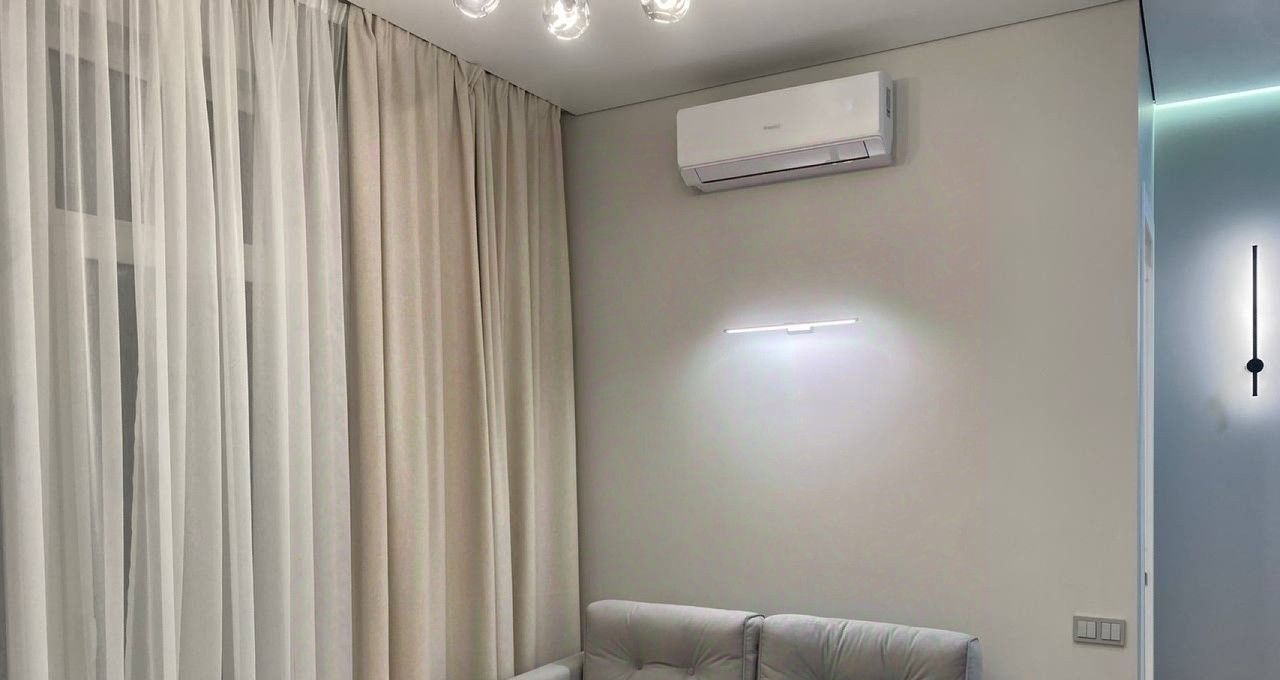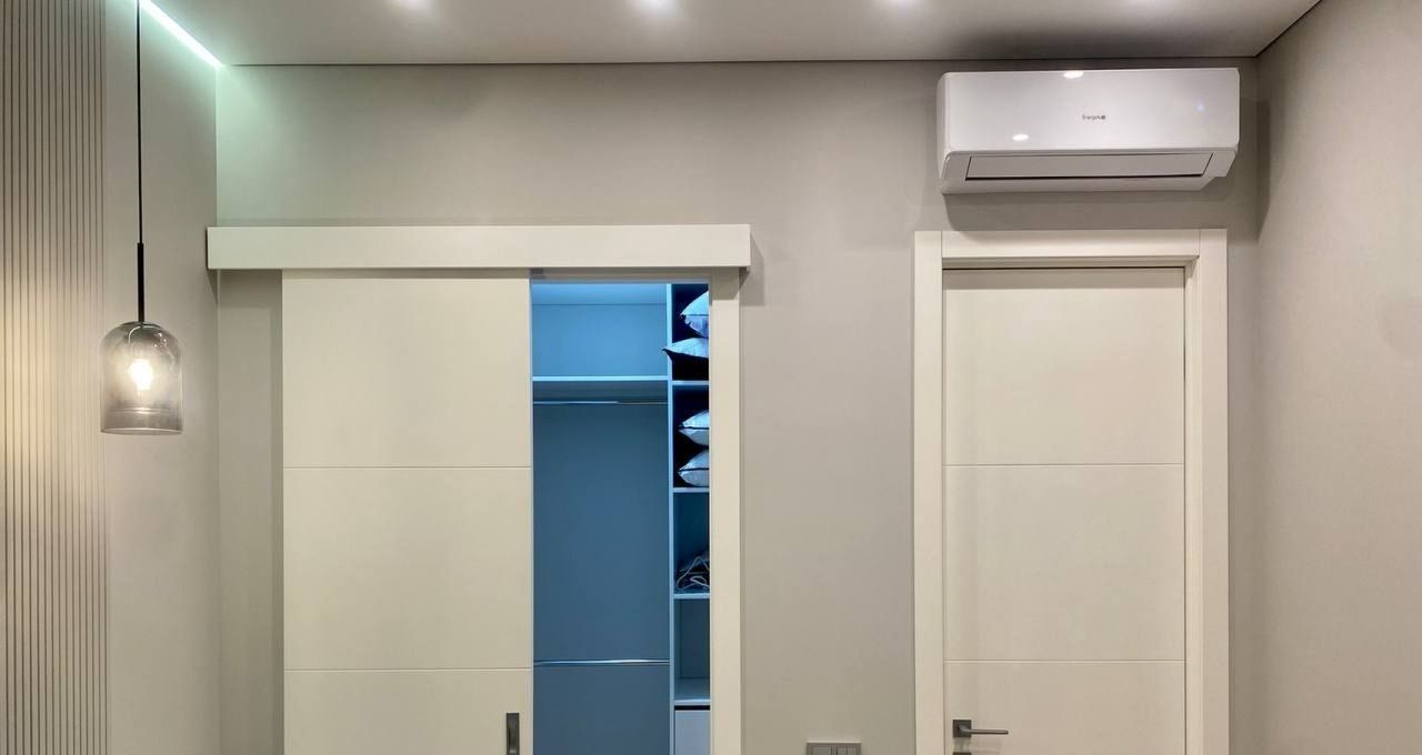 - Кухня с техникой (холодильник, микроволновка, духовой шкаф, посудомоечная машина), стирально-сушильная машина, кондиционер в каждой комнате, две гардеробные.