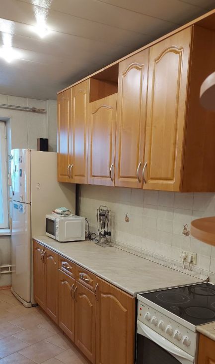 Просторная кухня площадью 10 м² полностью оборудована всей необходимой техникой: холодильник, плита, микроволновая печь.