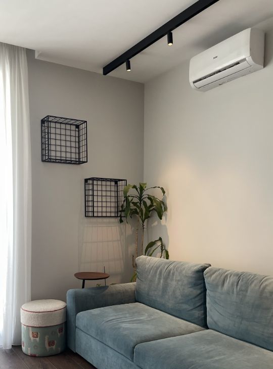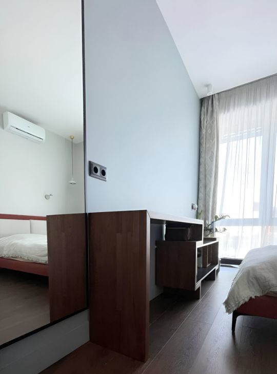 Вся техника встроенная и качественная (холодильник Libherr, духовка, СВЧ, индукционная плита, посудомоечная машина -NEFF, кондиционеры в спальне и в кухне гостиной- Haier, стиральная машинка), теплые полы, регулируемое отопление, в ванной установлен тропический душ, в кухне-гостиной раскладывающийся диван, дубовый стол ручной работы.