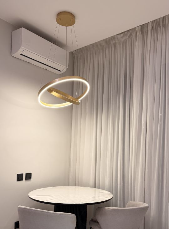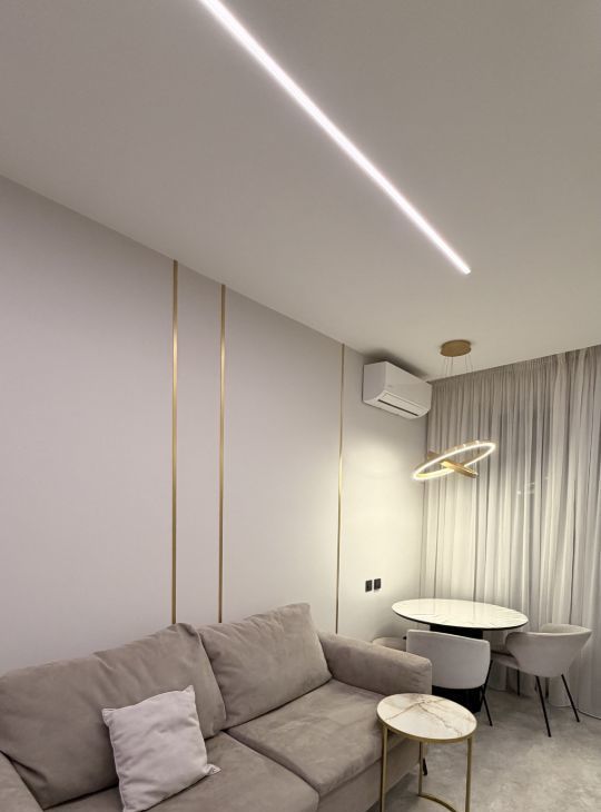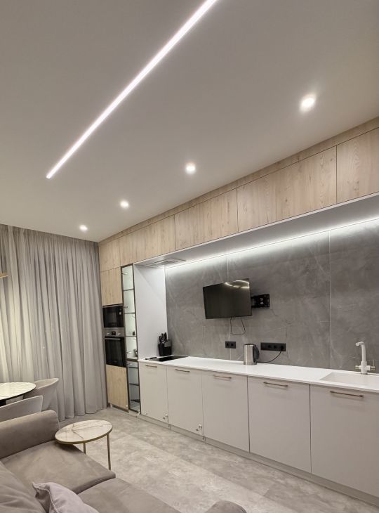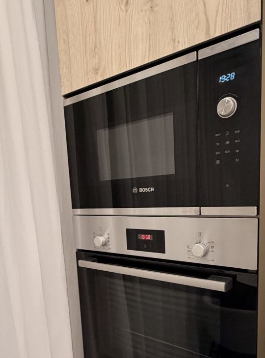 Квартира полностью готова к комфортному проживанию. Здесь есть всё необходимое: дорогая качественная встроенная мебель с европейской фурнитурой, кондиционер для комфортного климата, а также полный набор бытовой техники — холодильник, посудомоечная машина, встроенная микроволновая печь и духовой шкаф Bosch, телевизор.