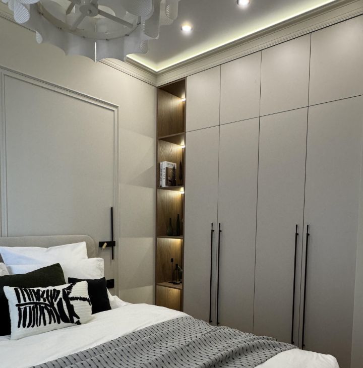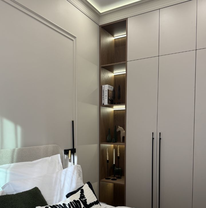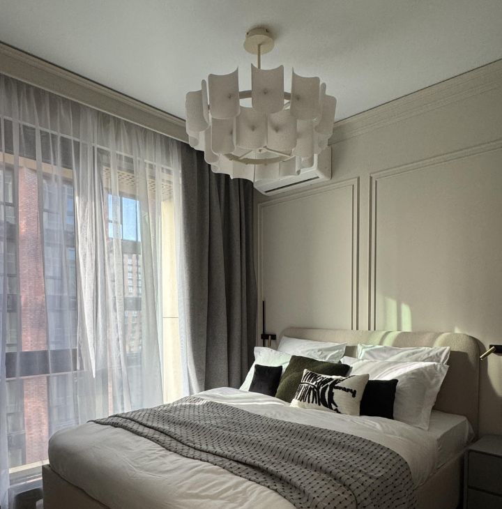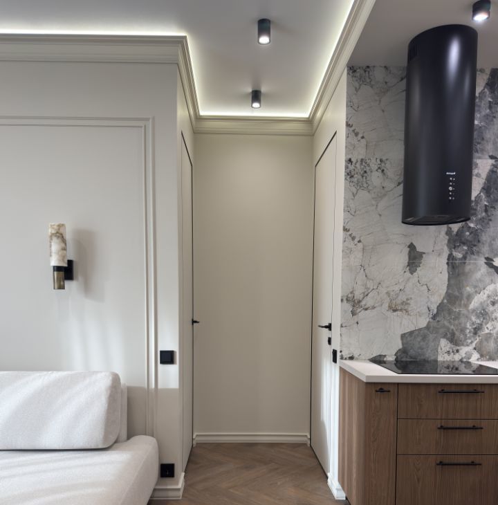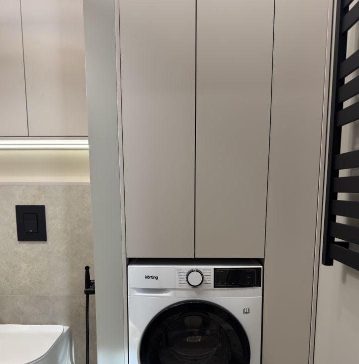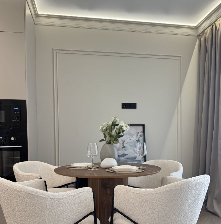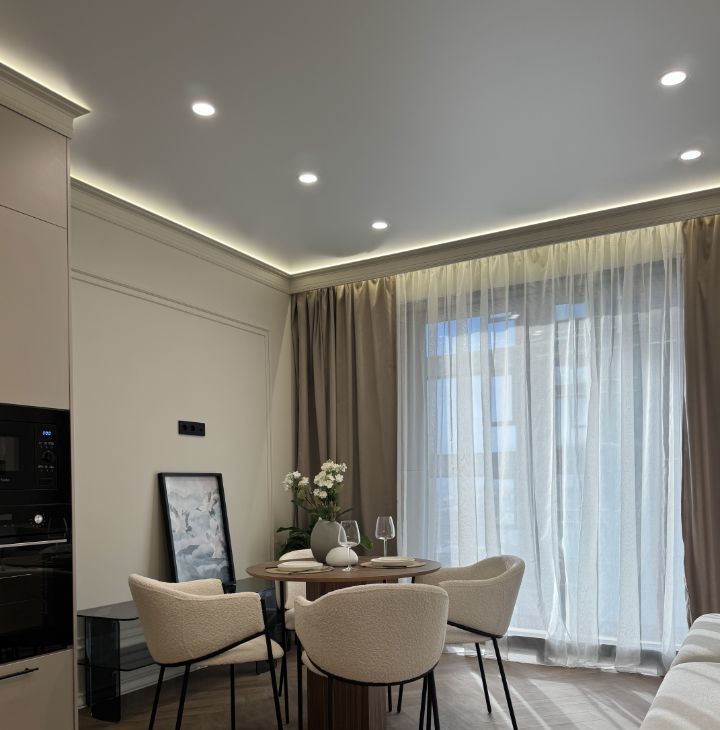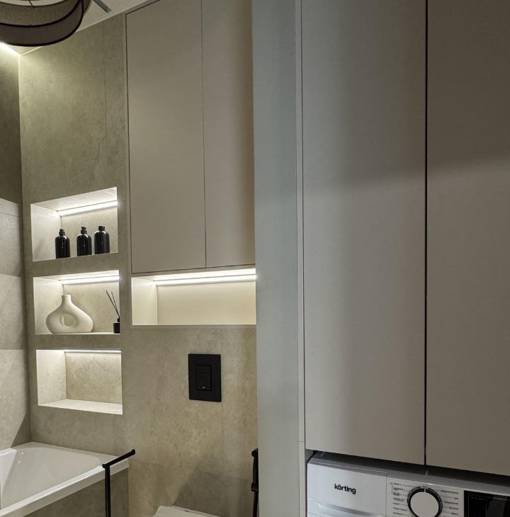 Ремонт выполнен с использованием качественных, современных материалов, который подчеркивает стиль и изысканность интерьера. Квартира полностью оборудована всей необходимой современной встроенной бытовой техникой: духовой шкаф, СВЧ печь, ПММ 60 см, холодильник, Стиральная машина с функцией сушки, варочная панель, вытяжка, фильтр для питьевой воды. Предусмотрен 21 сценарий освещения. Двери скрытого монтажа высотой 2.3 метра. На полу SPC-ламинат который не боится влаги и при этом теплый и приятный для глаз. Вся мебель в квартире встроена и изготовлена на заказ, что дает большое количество мест хранения и визуальную гармонию.