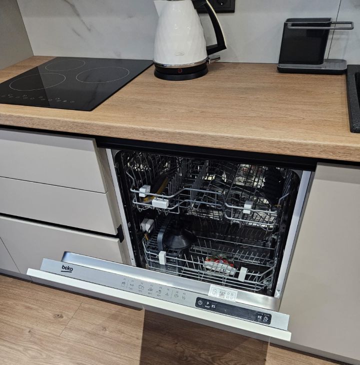 Встроенная кухня оборудована духовым шкафом, микроволновой печью, посудомоечной машиной, посудой. Диван раскладывающийся с пружинным блоком. Телевизор, кондиционер, интернет.