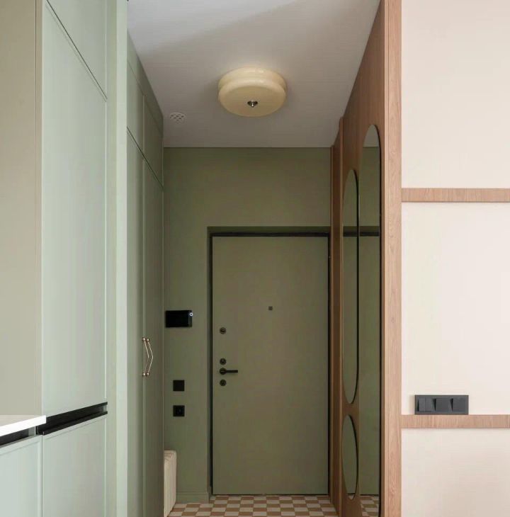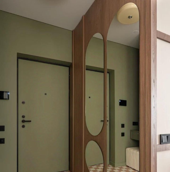 В коридоре установлен вместительный встроенный шкаф, есть пуф, зеркало в полный рост