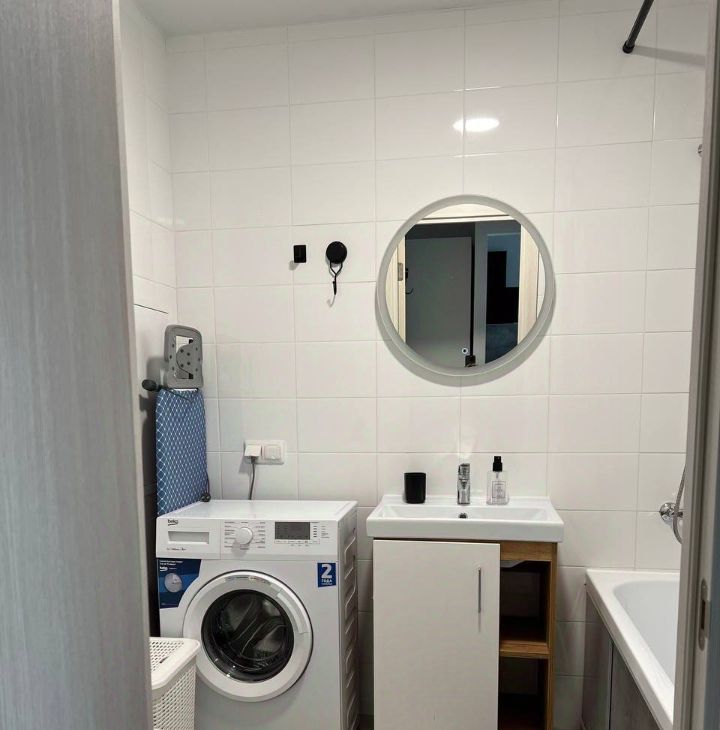 В ванной комнате стиральная машина.