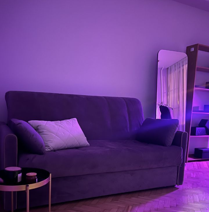В квартире есть всё необходимое для комфортного проживания: вместительный зеркальный шкаф, удобный ортопедический диван Hoff.