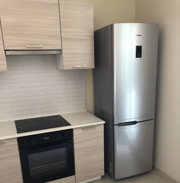 На кухне есть мебель, холодильник, варочная панель, духовой шкаф, электрический чайник, утюг, гладильная доска, стол и стулья.