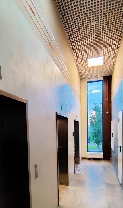 На этаже 6 квартир и 3 лифта.