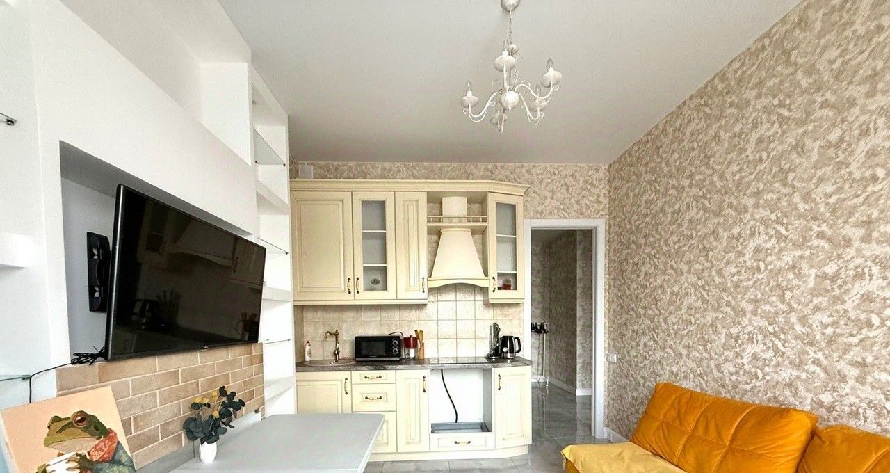 В кухне-гостиной диван для отдыха, напротив телевизор. Установлен кондиционер для комфортного проживания.