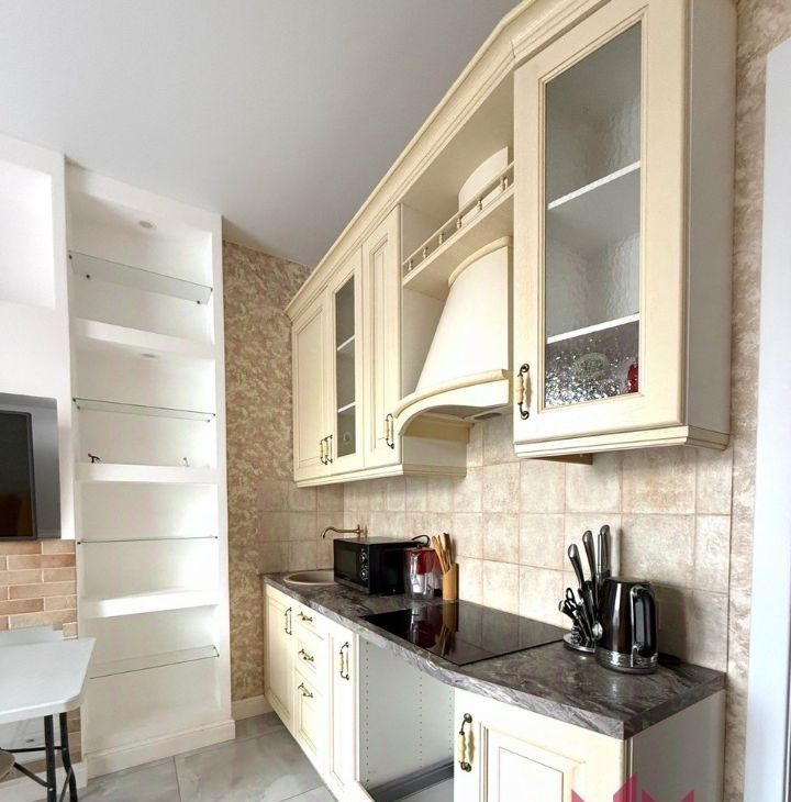 Кухонная зона оборудована качественной бытовой техникой. Укомплектована индукционной плитой, могут установить духовой шкаф, холодильник, вытяжка, вместительные шкафчики, микроволновая печь.