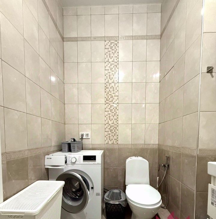 Совмещенный санузел с ванной - установлено зеркало с умной подсветкой, шкафчики для хранения бытовых принадлежностей, установлена стиральная машинк.