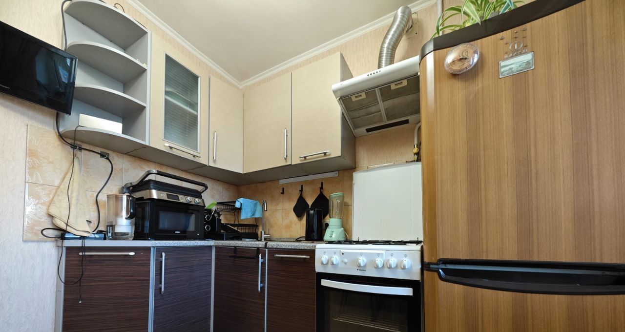 Газовая плита, холодильник, стиральная машина, микроволновая печь, вытяжка, телевизор.