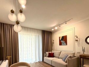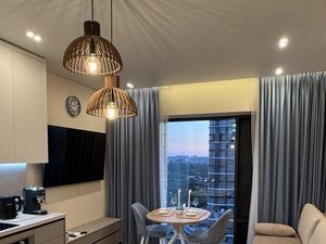 Сдаётся стильная однокомнатная квартира с дизайнерским ремонтом на 46 этаже нового дома 2024 года постройки. Общая площадь квартиры составляет 42 кв. м, из которых 24 кв. м отведены под просторную кухню. Окна выходят на улицу, открывая потрясающий вид на город.