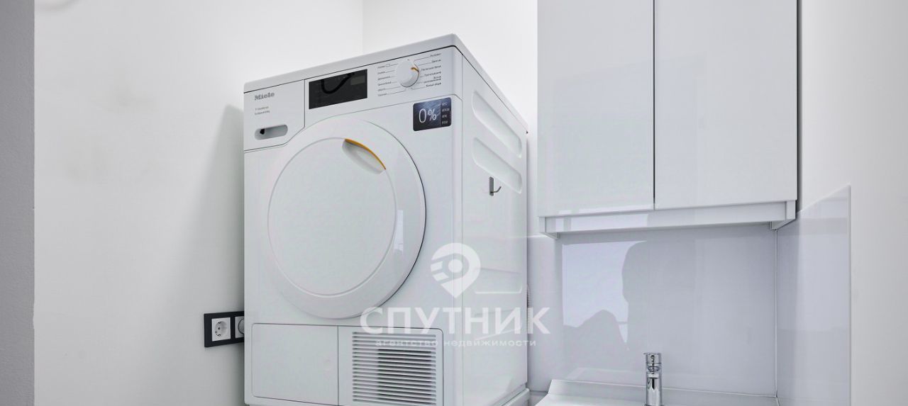 Отдельная постирочная комната: полноценная стиральная и сушильная машины — никаких ванн, заставленных техникой.