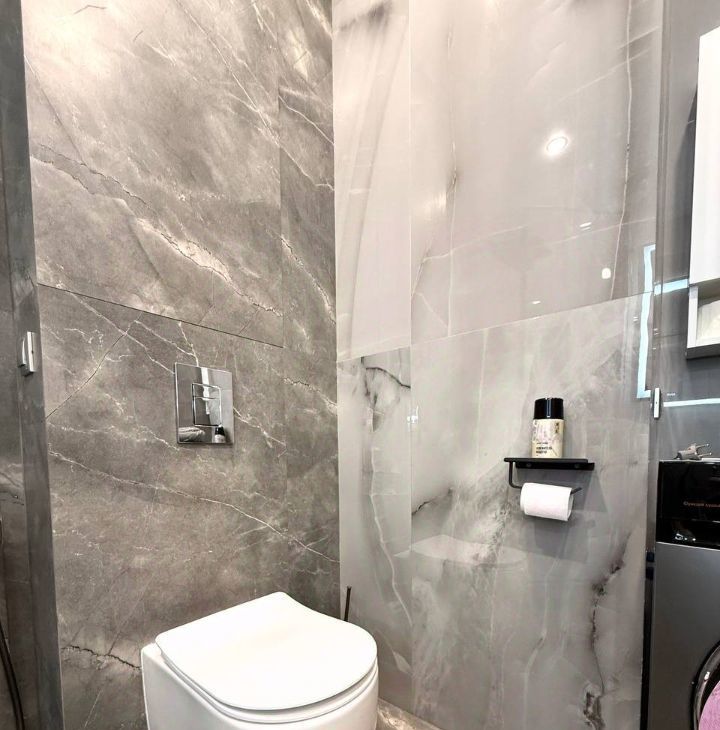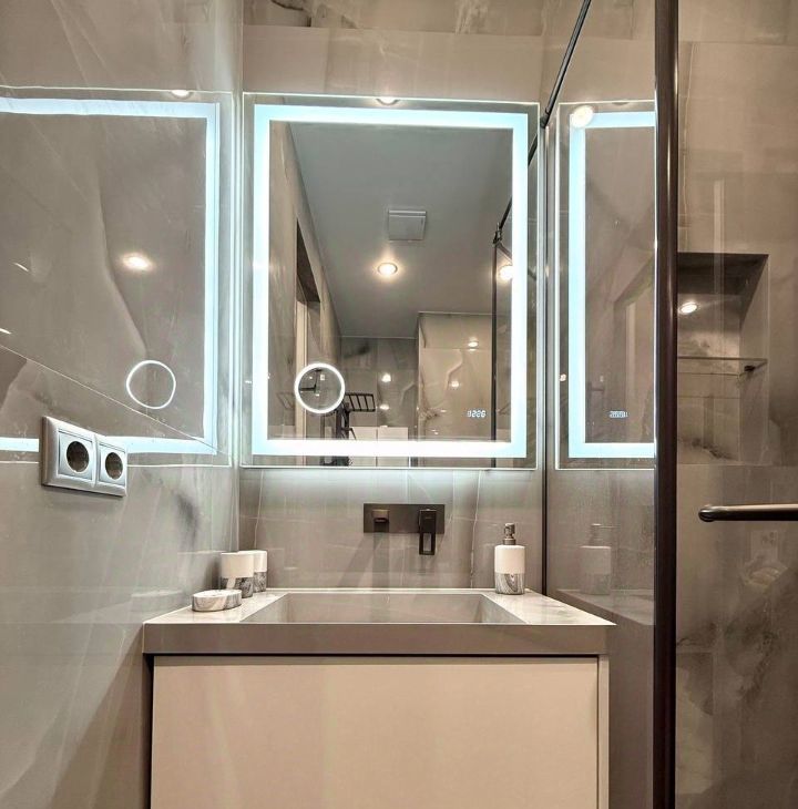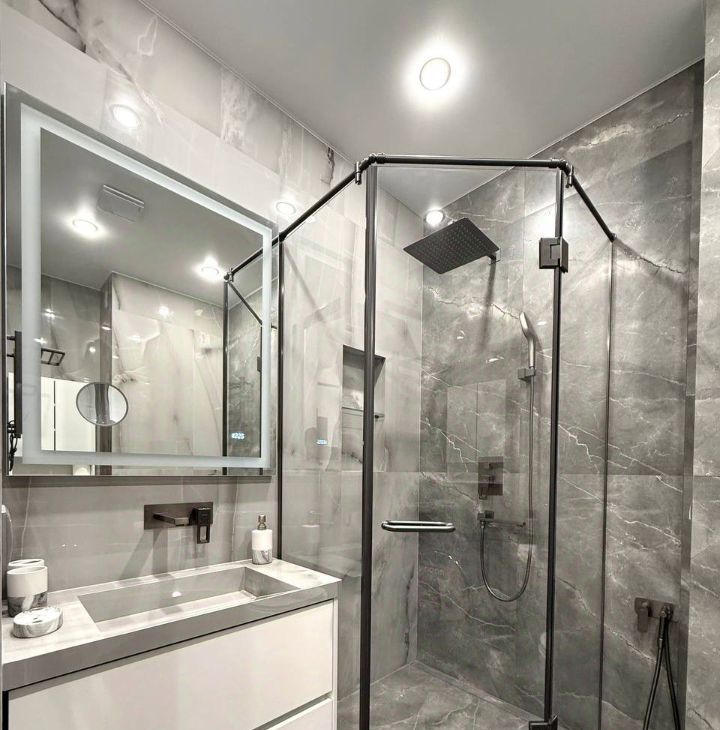 Совмещенный санузел с душевой кабиной, зеркало с умной подсветкой, полотенцесушитель, стиральная машина с функцией сушки.