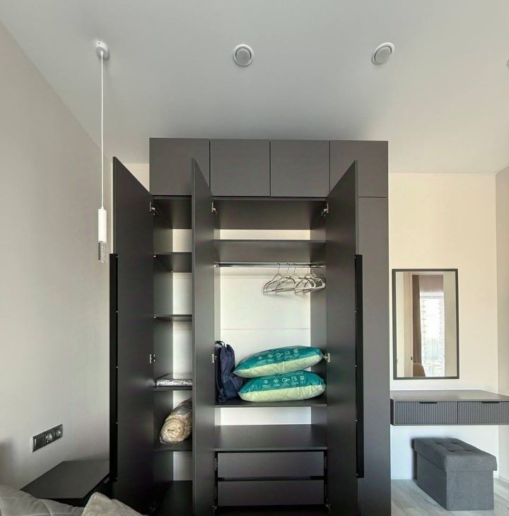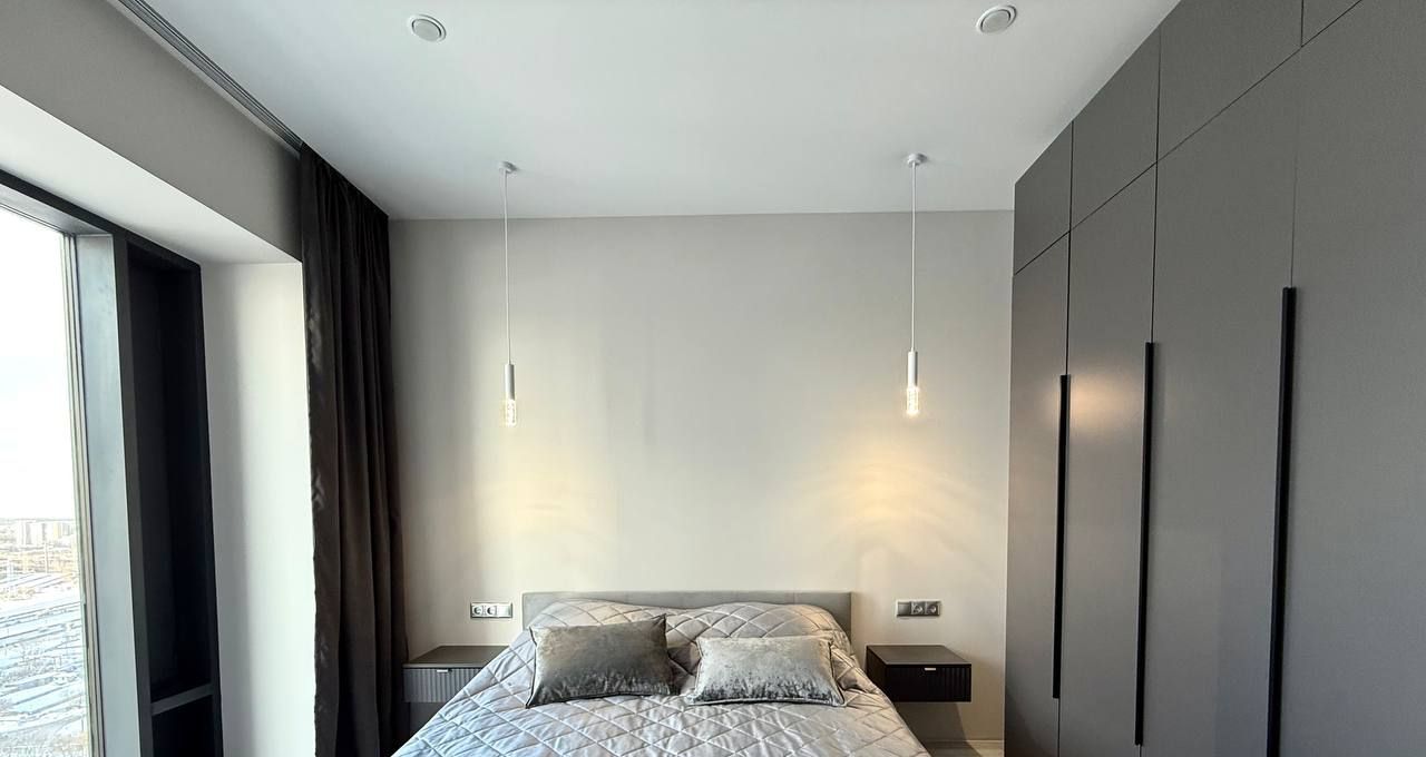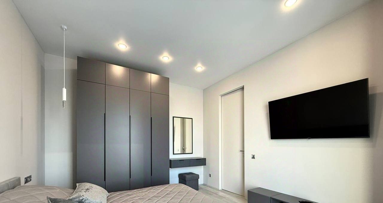 Спальня с двуспальной кроватью (ортопедический матрас), вместительный шкаф, много систем подсветок, напротив еще один телевизор. Установлен бризер в спальне, шторы блэк аут.