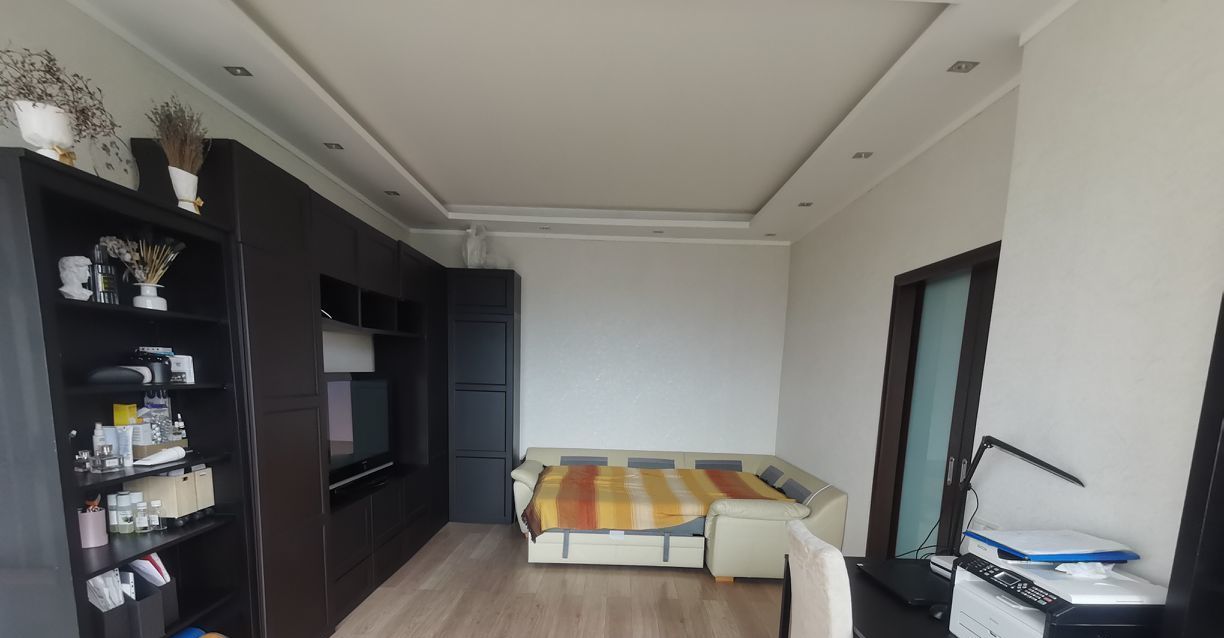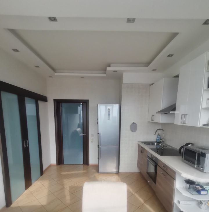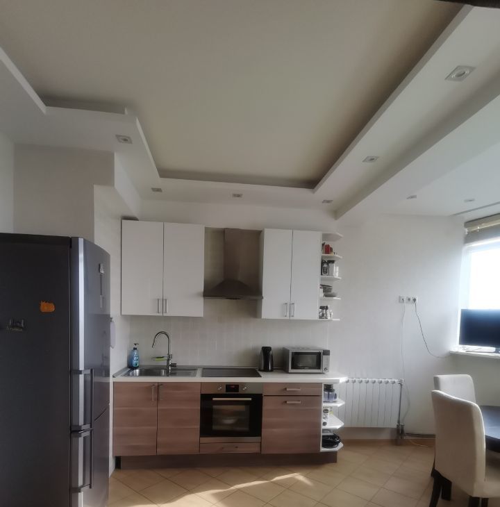 В большой кухне-гостиной установлен современный кухонный гарнитур с встроенной техникой: варочной панелью, духовым шкафом и вытяжкой. Двухкамерный холодильник. Так же есть раскладной диван под одно спальное место.
