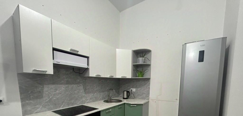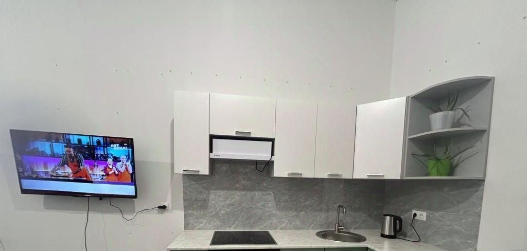 Просторная кухня-гостиная ( 18 кв.м) и спальня - 14 кв.м. Высокие потолки, 4 метра, в квартире легко дышится. Вся необходимая мебель и техника имеется, есть духовка, варочная панель, посудомоечная машина, холодильник, микроволновка, телевизор, кондиционер. В кухн-гостиной раскладной диван, в спальне двухспальная кровать и вместительный шкаф. Сан узел совместный. Стиралка есть, ванна. Люстры будут установлены сегодня.