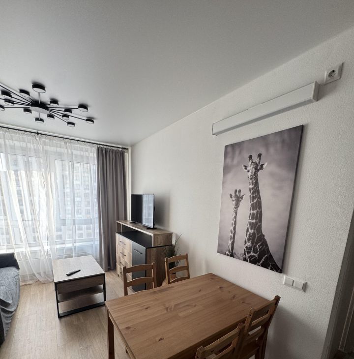 В квартире выполнен качественный евроремонт. Просторная кухня площадью 18 кв. м оборудована всей необходимой мебелью и техникой, включая холодильник, телевизор и стиральную машину. В жилой комнате также есть мебель, создающая комфортные условия для проживания. Санузел совмещенный и оснащен ванной, поэтому можно расслабиться после долгого дня.