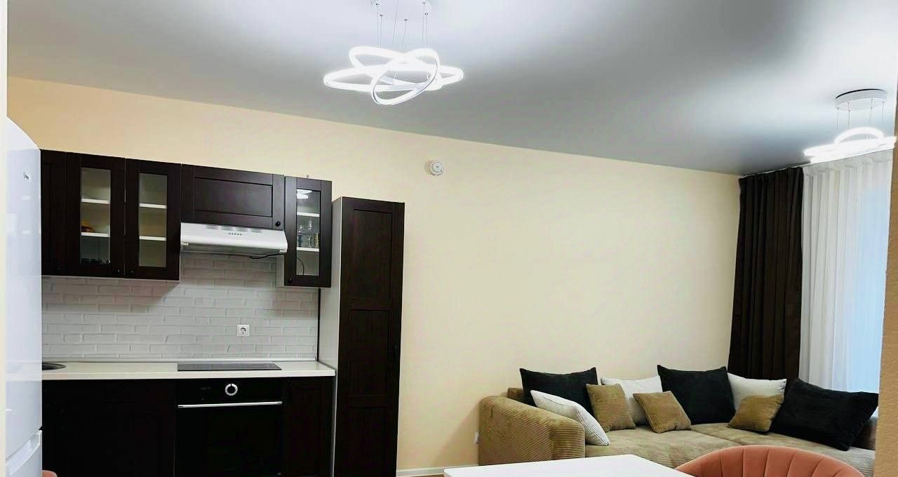 Квартира полностью укомплектована мебелью и техникой. В вашем распоряжении: стиральная машина Samsung на 6 кг, холодильник Indesit, варочная панель и духовой шкаф Gorenje, вытяжка Korting, микроволновая печь, телевизор, удобная обеденная зона, большой раскладной диван, двуспальная кровать с мягким изголовьем и вместительный шкаф для хранения. Всё в отличном состоянии.