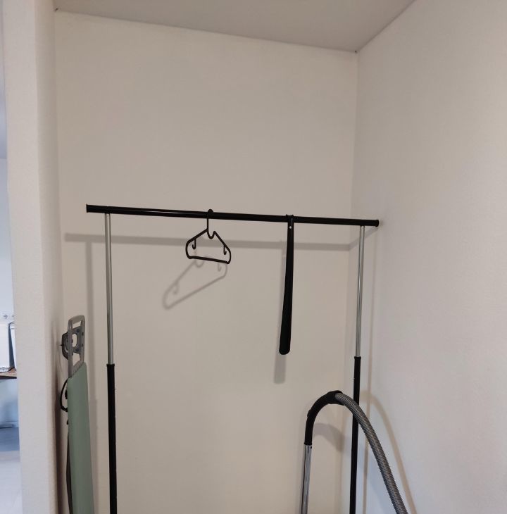 Есть гладильная доска, вентилятор, телевизор.