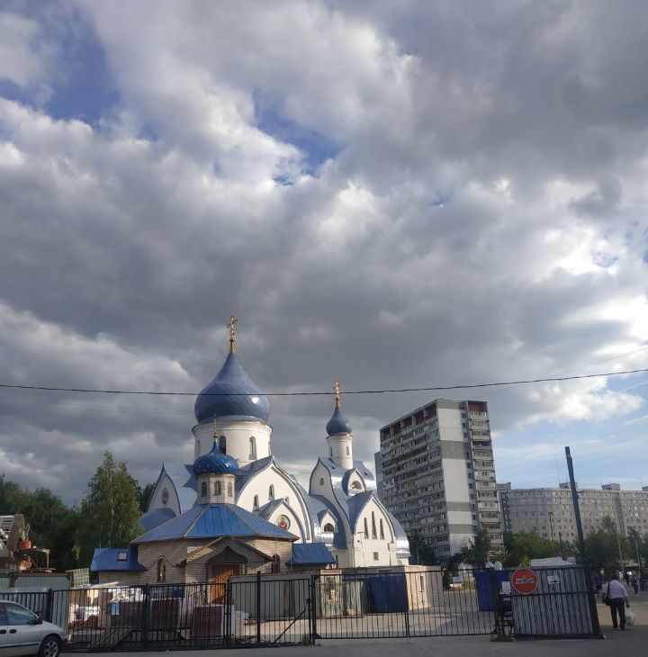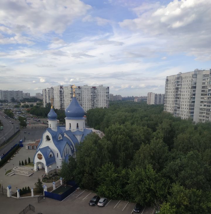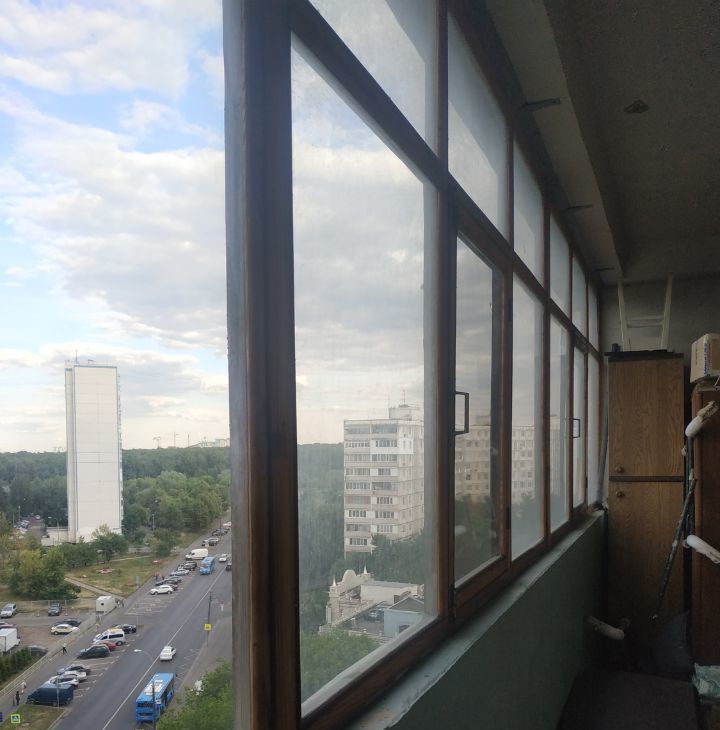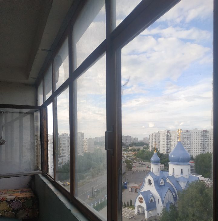 Большая застекленная лоджия на кухню и комнату. Окна выходят на Храм.