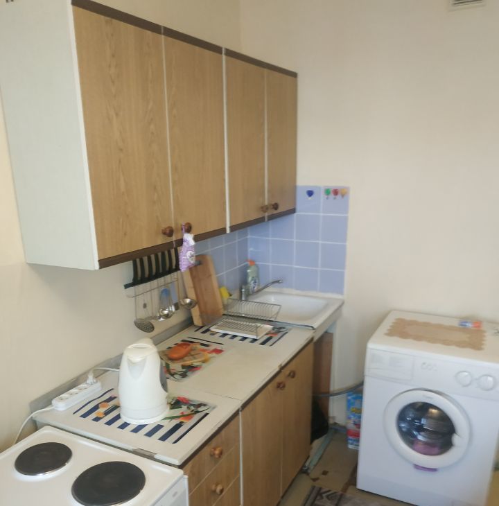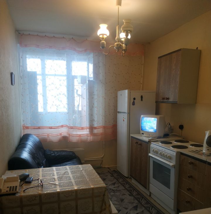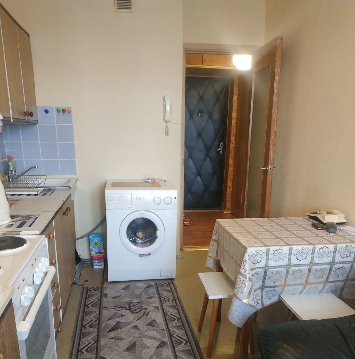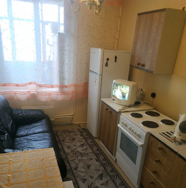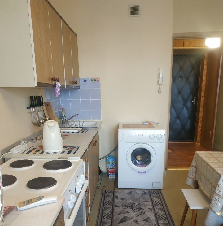 На кухне: кухонный гарнитур, обеденный стол, кожаный диван, холодильник, стиральная машина автомат, тв. Сан. узел совмещенный.
