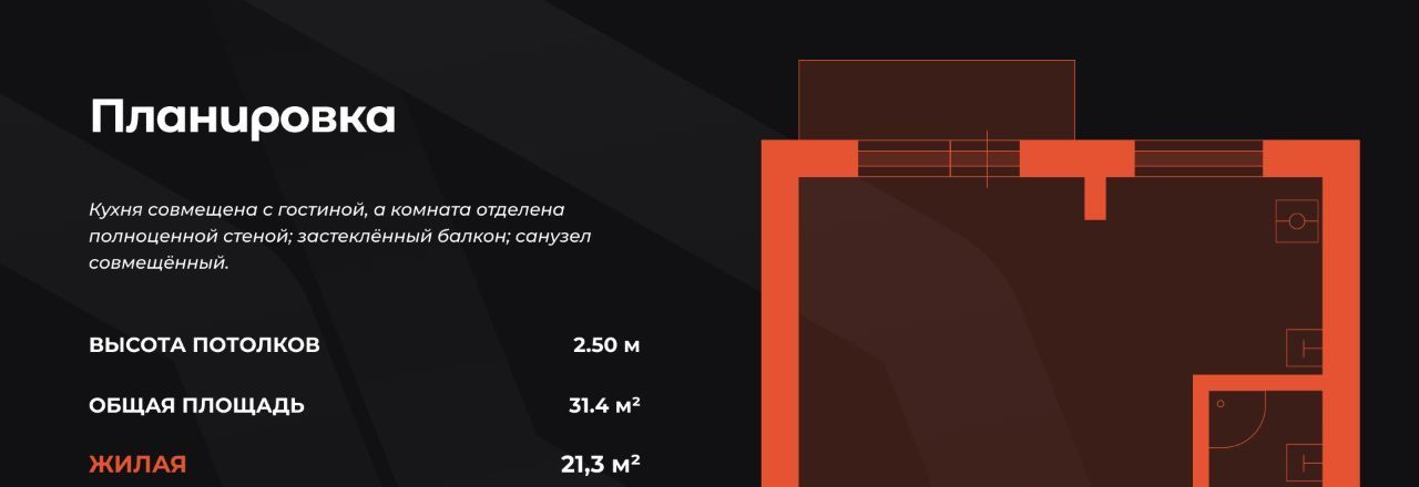 Кухня совмещена с гостиной, а комната отделена полноценной стеной; застеклённый балкон; санузел совмещённый.