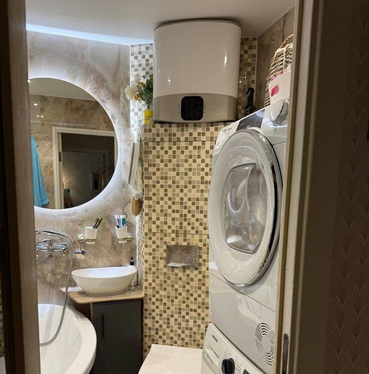 Совмещенный санузел с теплым полом и водонагревателем. Не придется страдать в период отключения горячей воды. Имеются стиральная и сушильная машины.