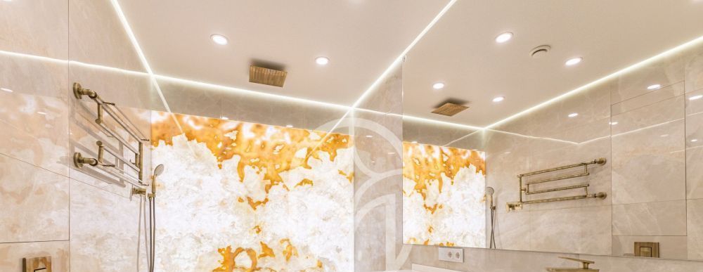 Санузел премиум-класса:отделка натуральным оником с мягкой подсветкой — эффектный акцент, создающий атмосферу спа-отеля. Сантехника Villeroy & Boch, организована отдельная постирочная зона.