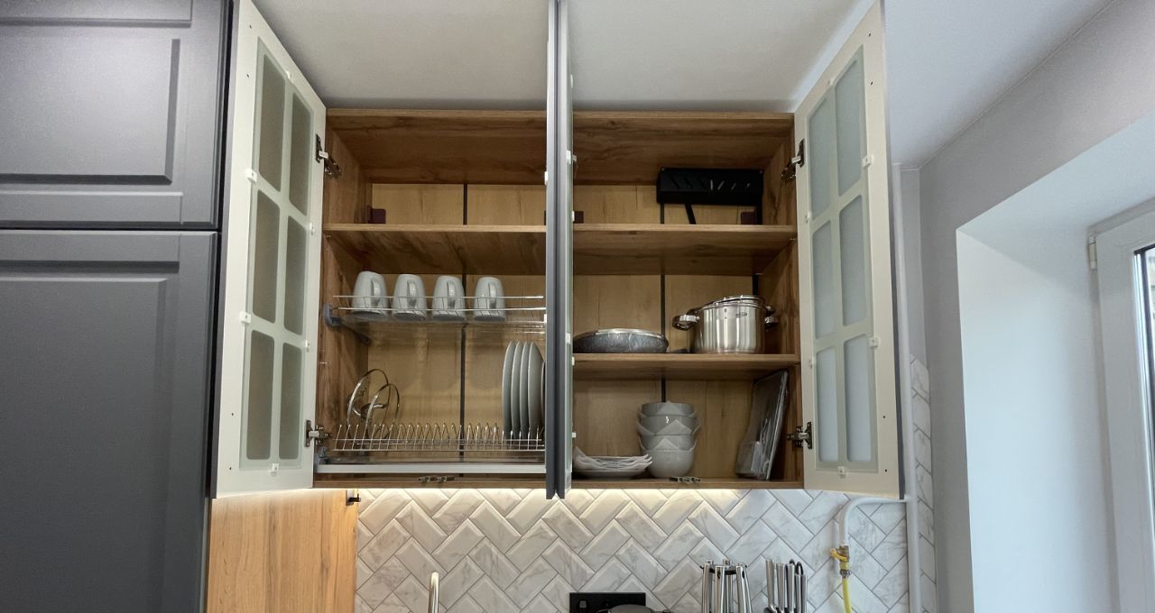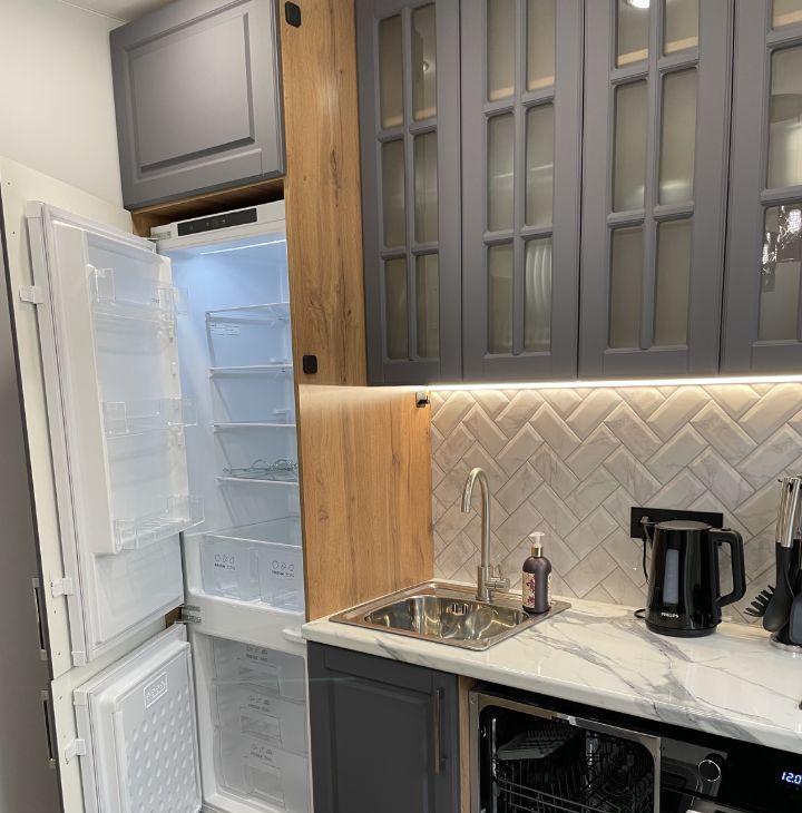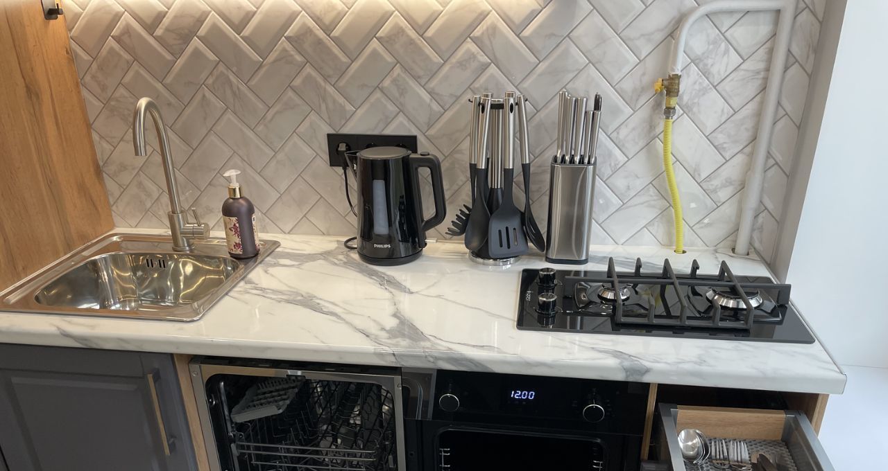 На кухне есть встроенный холодильник, посудомоечная машина, духовой шкаф и газовая плита. Есть вся необходимая посуда. Посуда тоже вся новая.