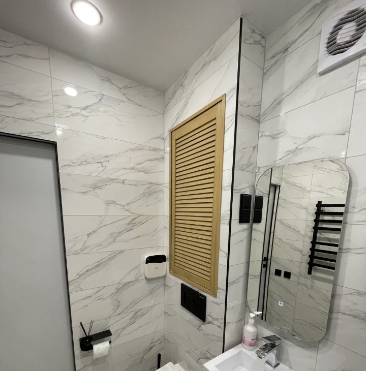 В ванной комнате установлен тропически душ, электрический полотенцесушитель, встроенная инсталляция. Есть системы обнаружения протечки воды.