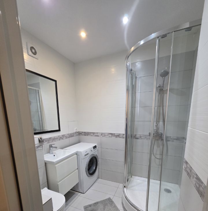В санузле душевая кабина , тумба с раковиной, стиральная машина, туалет .