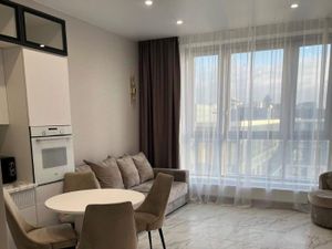 Планировка: спальня с зоной отдыха, кухня, санузел. Полностью меблирована. Кухня со встроенной бытовой техникой. Дизайнерский ремонт. Застеклённая лоджия. Окна выходят в тихий двор. Круглосуточная охрана.