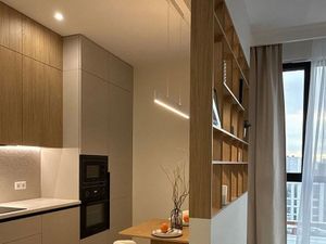 Апартаменты с 1-й спальней общей площадью 58 м² в комплексе Tribeca Apartments. Расположены на 2 этаже с панорамным остеклением в корпусе Liberty с видом на аллею двора. Внутри выполнена дизайнерская отделка в современном стиле. Кухня Scavolini со встроенной техникой (холодильник, посудомоечная машина, кух. плита+духовой шкаф). Ванная комната+стиральная машина. Планировка: холл+гардероб, кухня-гостиная, закрытая спальня+гардероб, раздельный санузел.