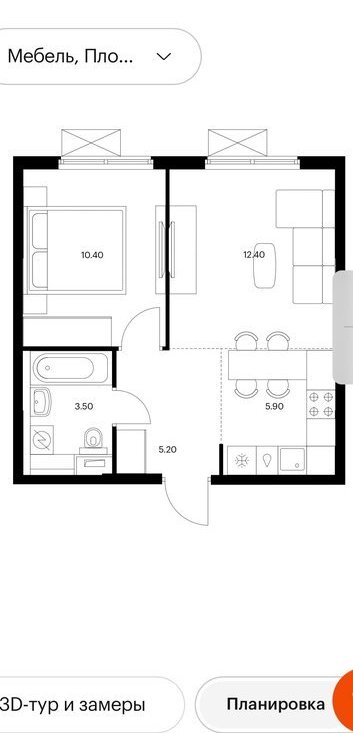 Очень удачная планировка, самая большая евро двушка в доме.