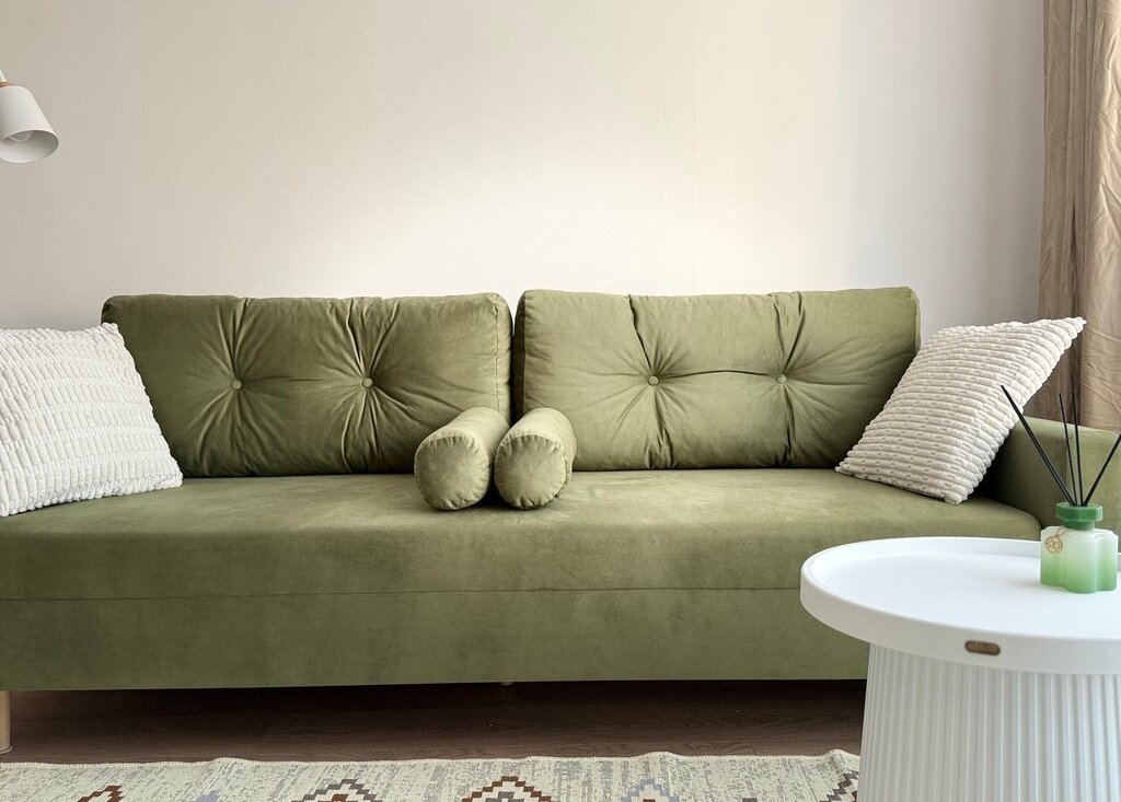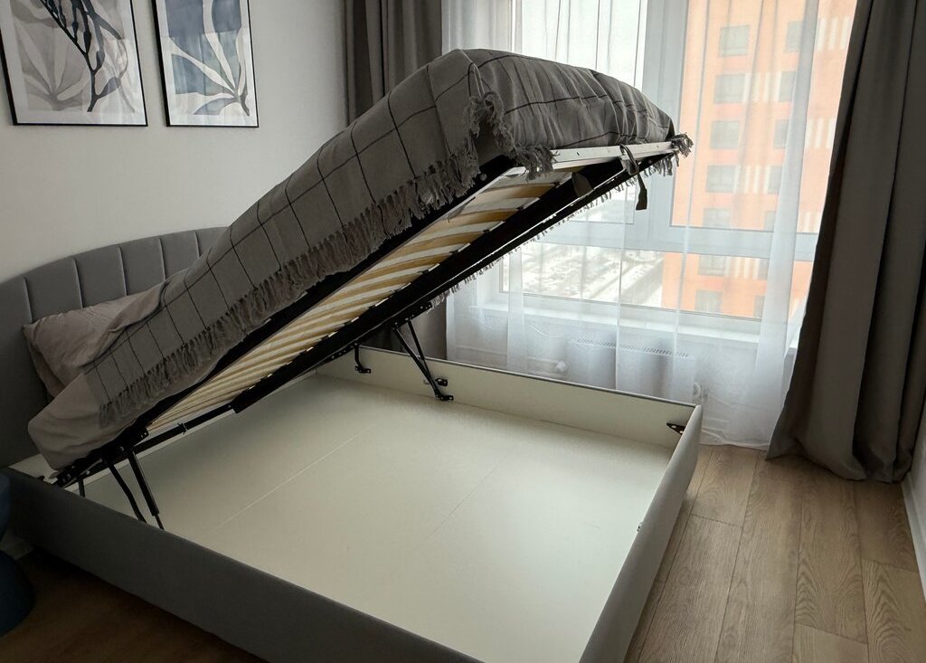 Кровать с подъемным механизмом, диван раскладной с нишей для белья, вместительные шкафы в спальне и коридоре.