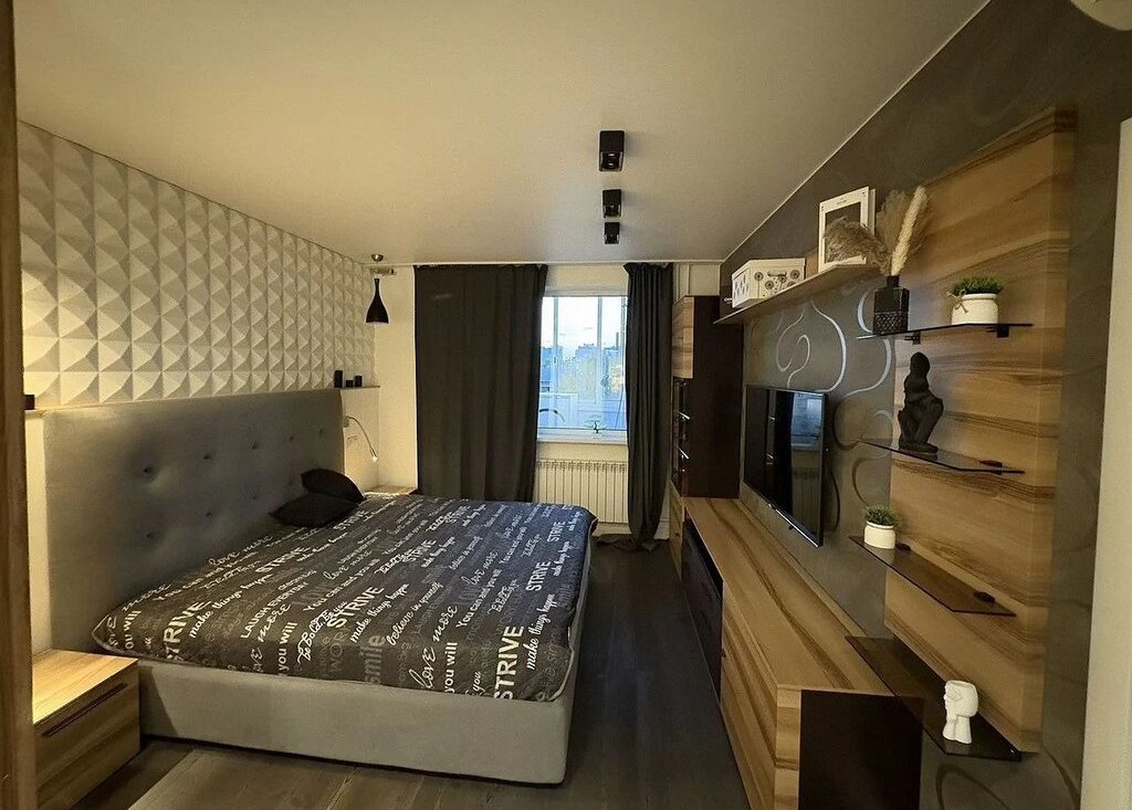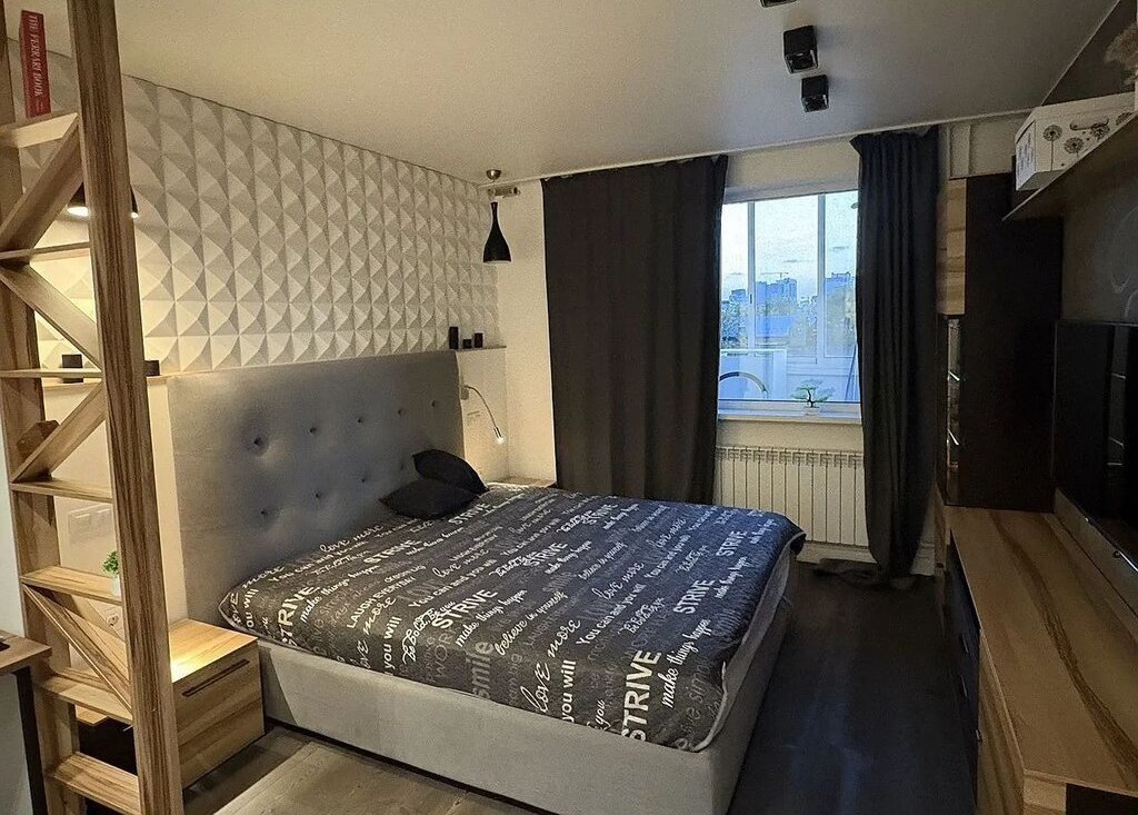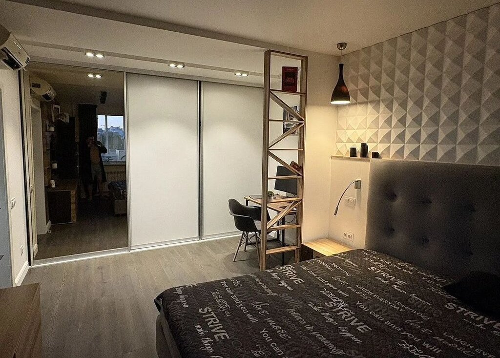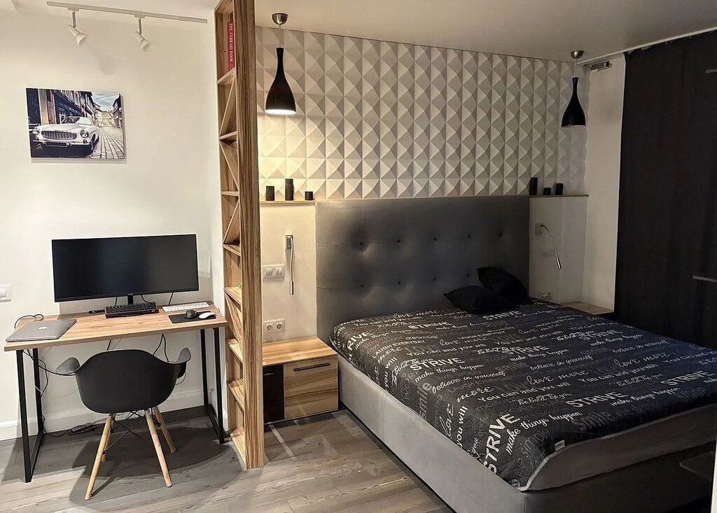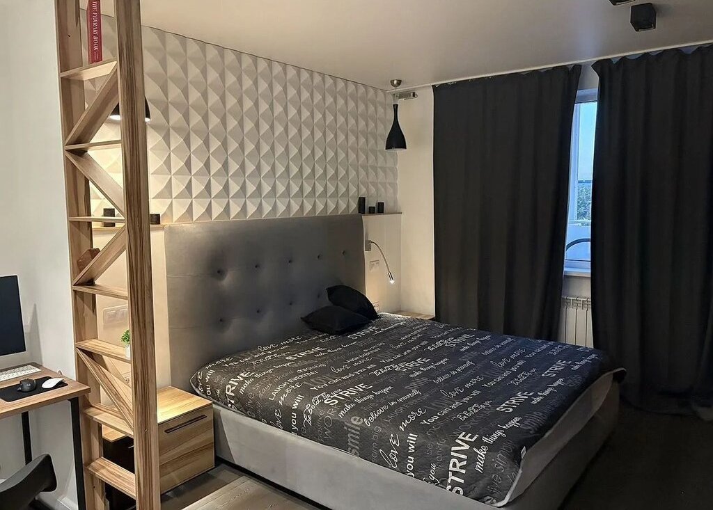 Большая комната с двуспальной кроватью 180×200 и декоративной перегородкой — уютное зонирование без потери света.