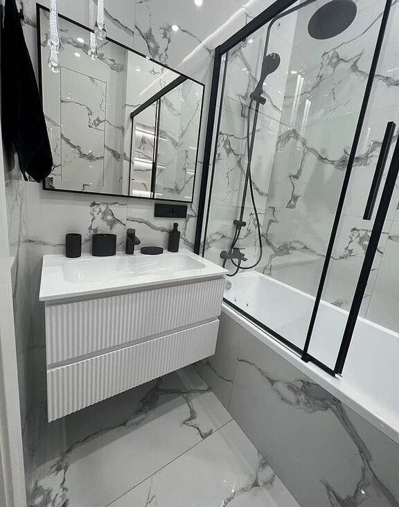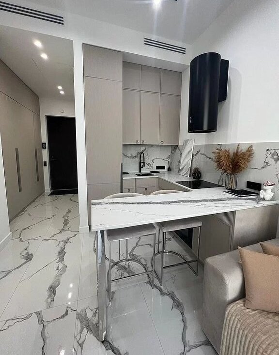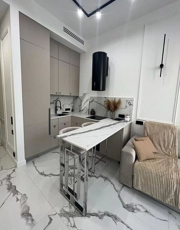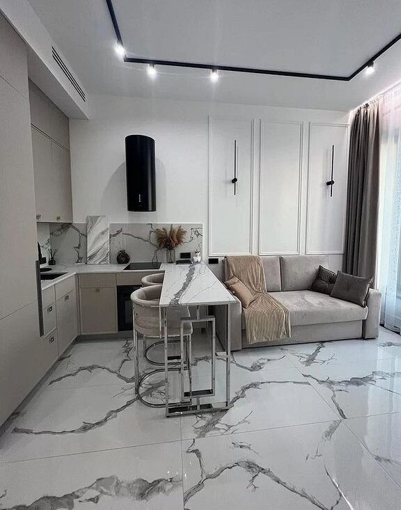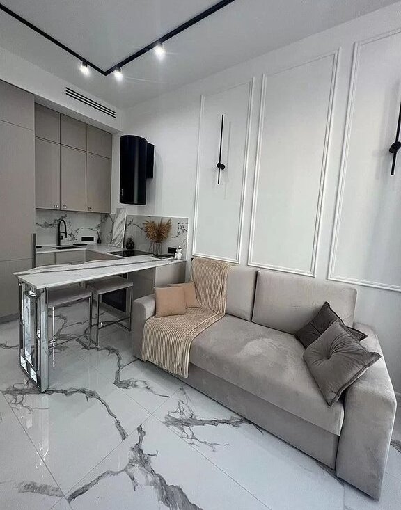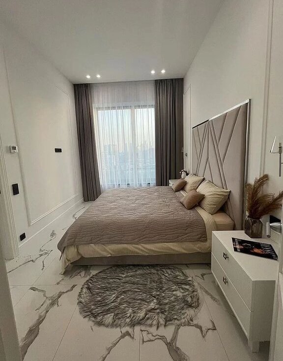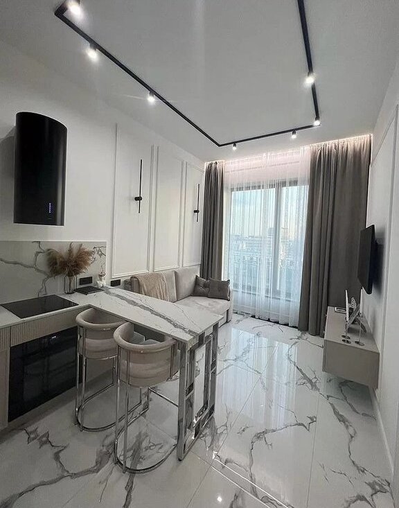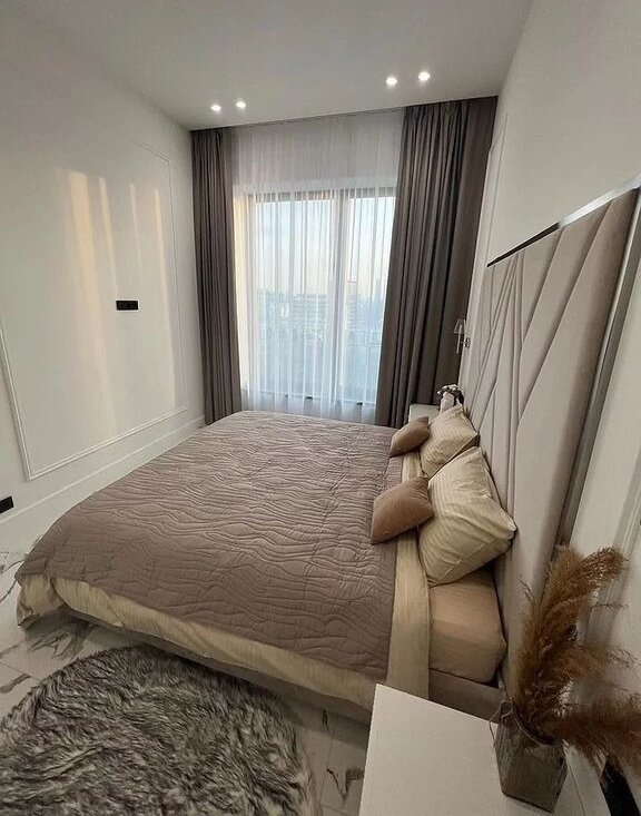 Апартамент 48 кв.м, удобная планировка, прихожая, атмосферная кухня-гостиная, гостевой санузел, просторная спальня, гардеробная, санузел с ванной и душем.