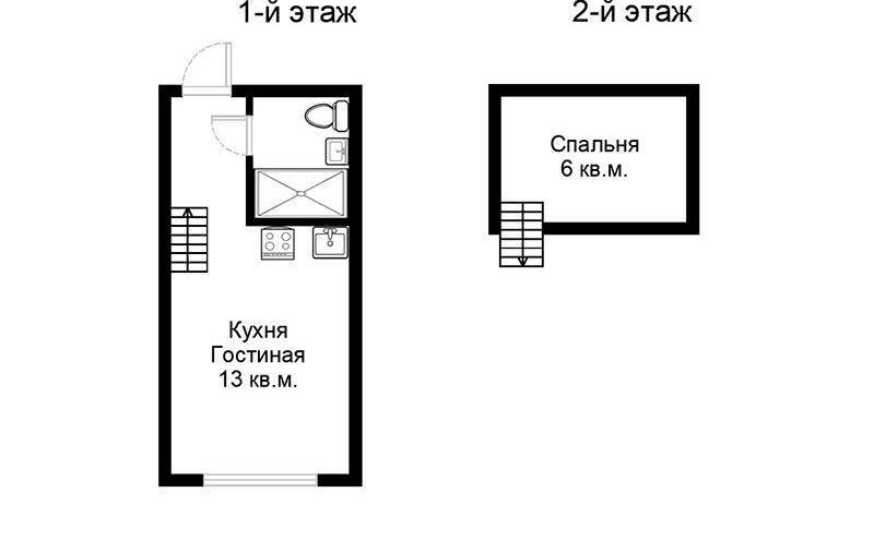 Характеристики: общая площадь 21.1 м2, первый этаж 15.1 м2, второй этаж 6 м2.