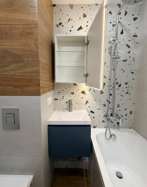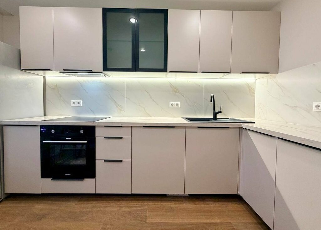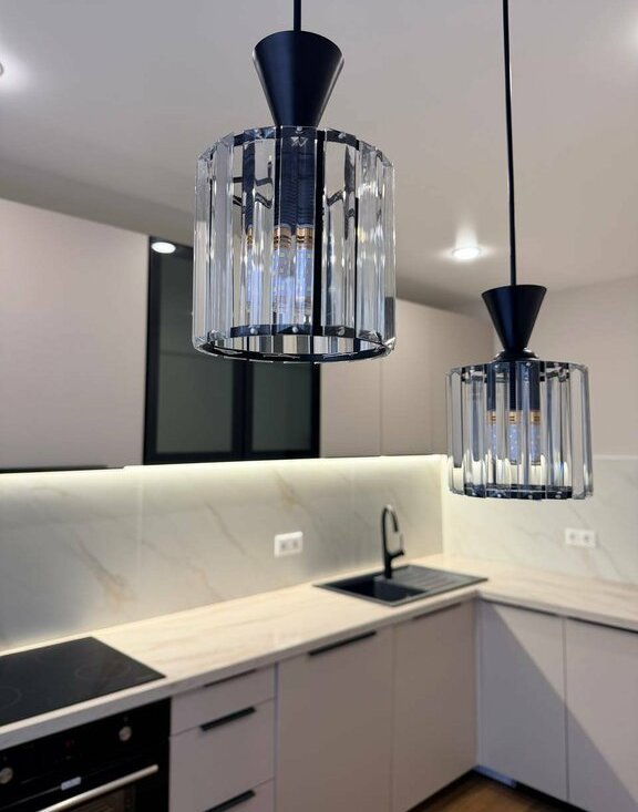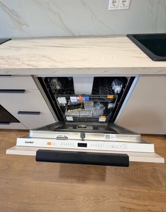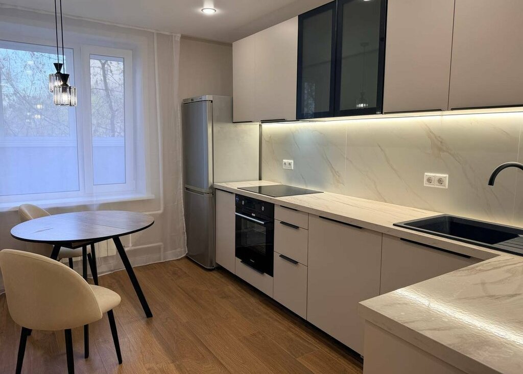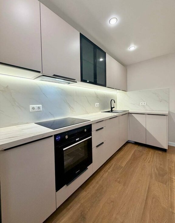 На кухне новый кухонный гарнитур со встроенной техникой, в том числе полноразмерной посудомоечной машиной 60 см с возможностью управления онлайн. Вся техника новая с гарантийными документами. В каждом помещении в квартире продуманы разные сценарии освещения: точечные подвесные светильники, основное освещение, подсветка штор, подсветка зеркала в ванной.