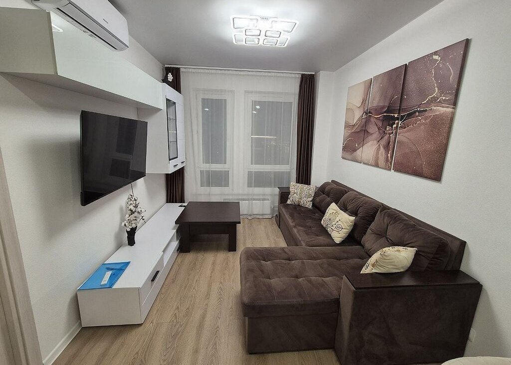 Планировка включает в себя отдельную спальню, совмещенную с гостиной кухню, смежный санузел и прихожую с гардеробом для хранения верхней одежды. Из больших окон открывается отличный вид на всю Москву. В квартире комфортно будет проживать 1-2 людям. В комплексе есть подземная парковка.